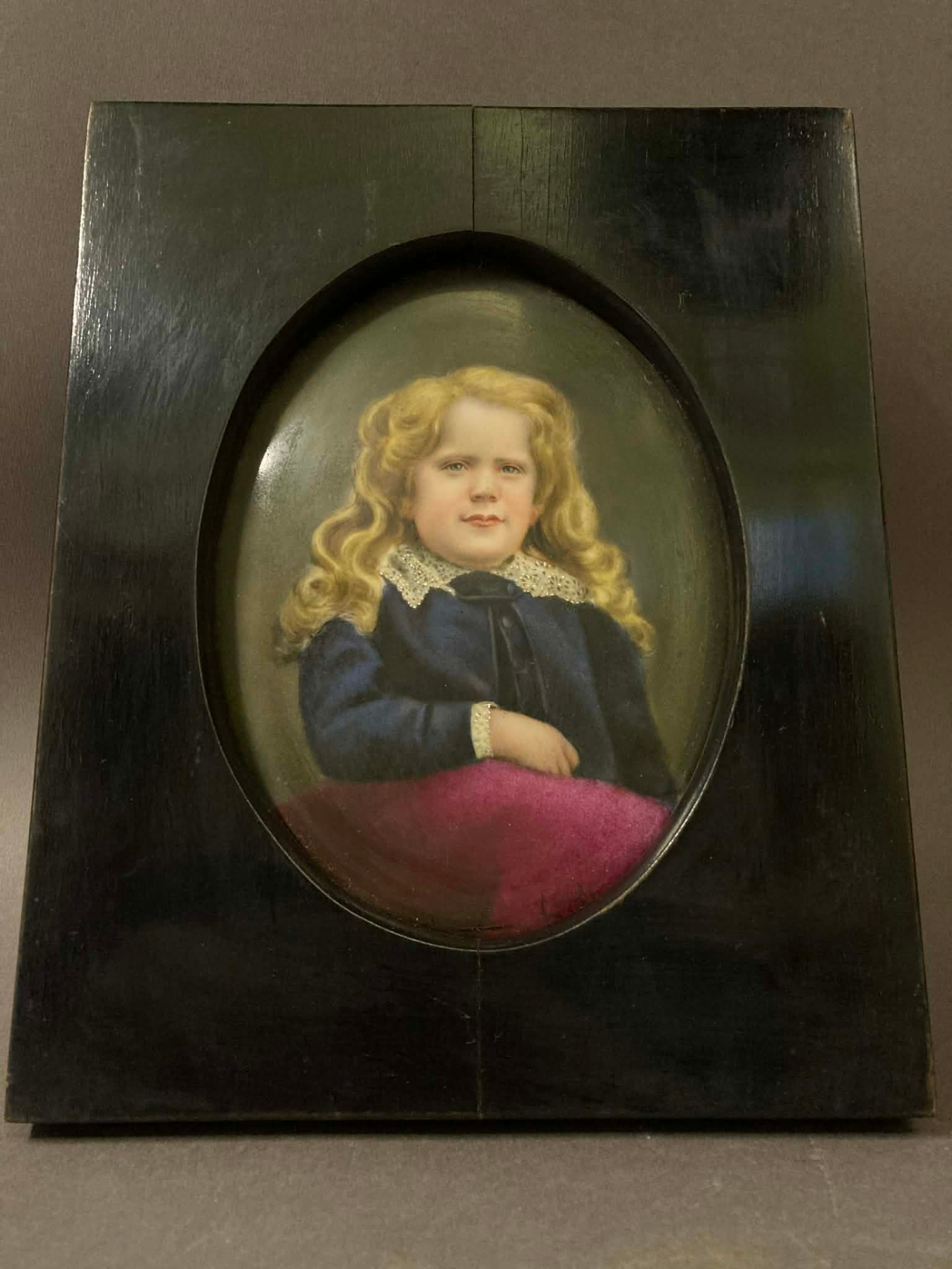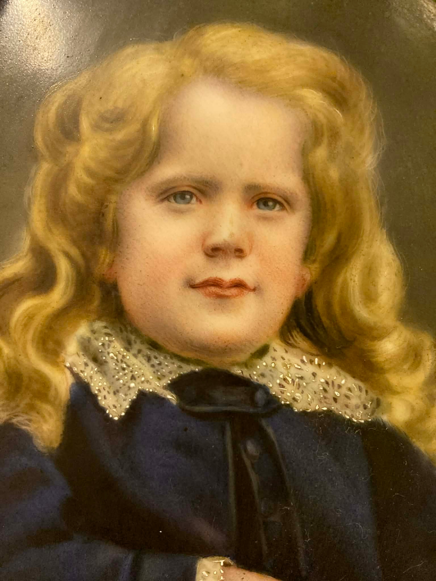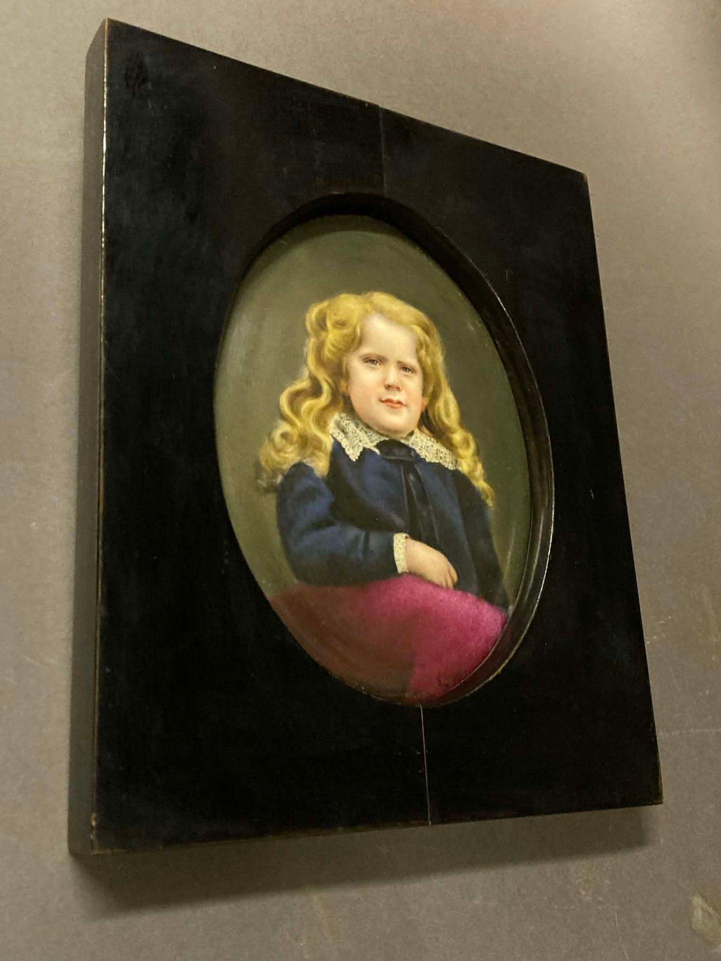 keretezett, jelzett ovál porcelánlapra festett gyermek ábrázolás,