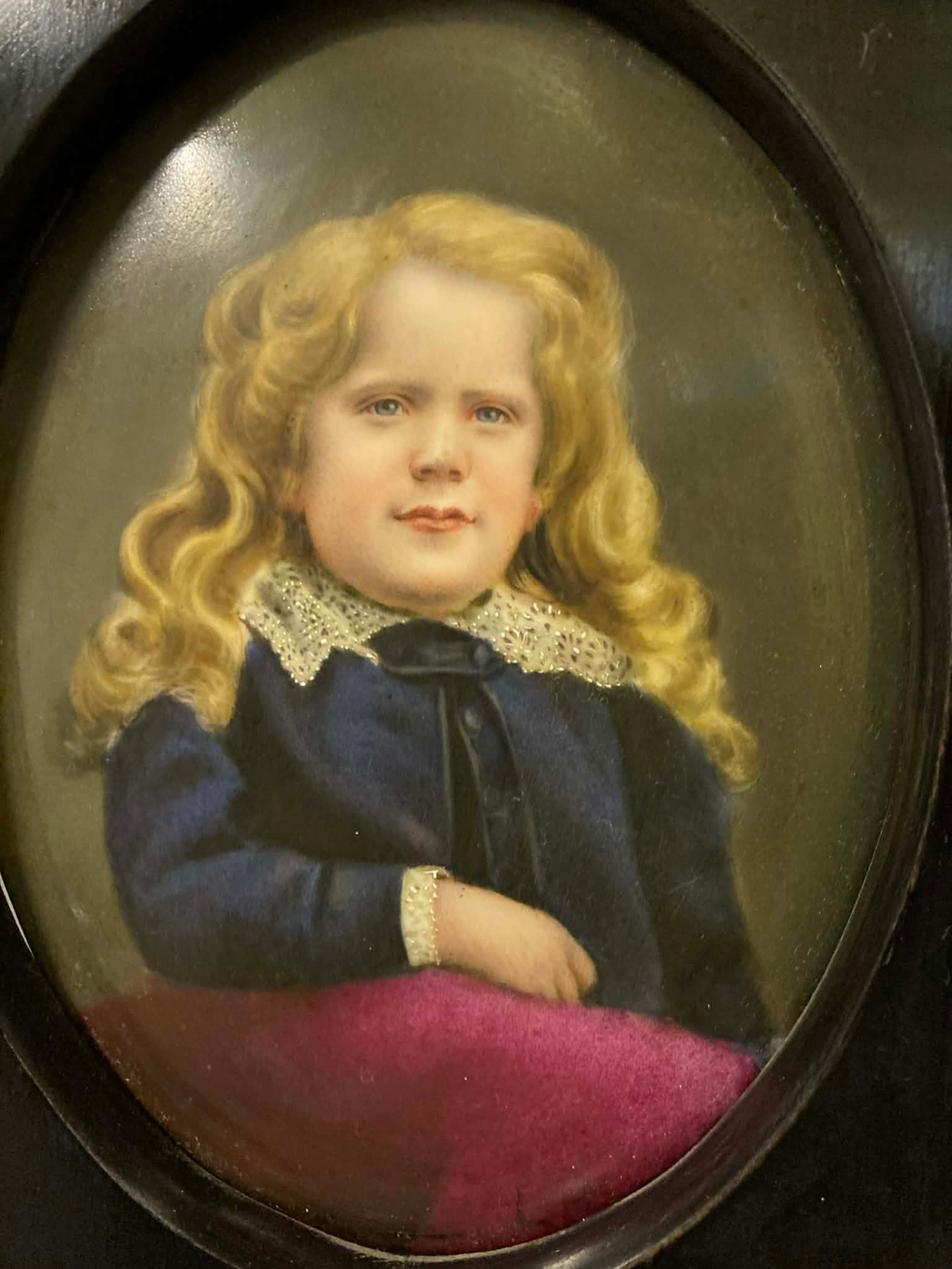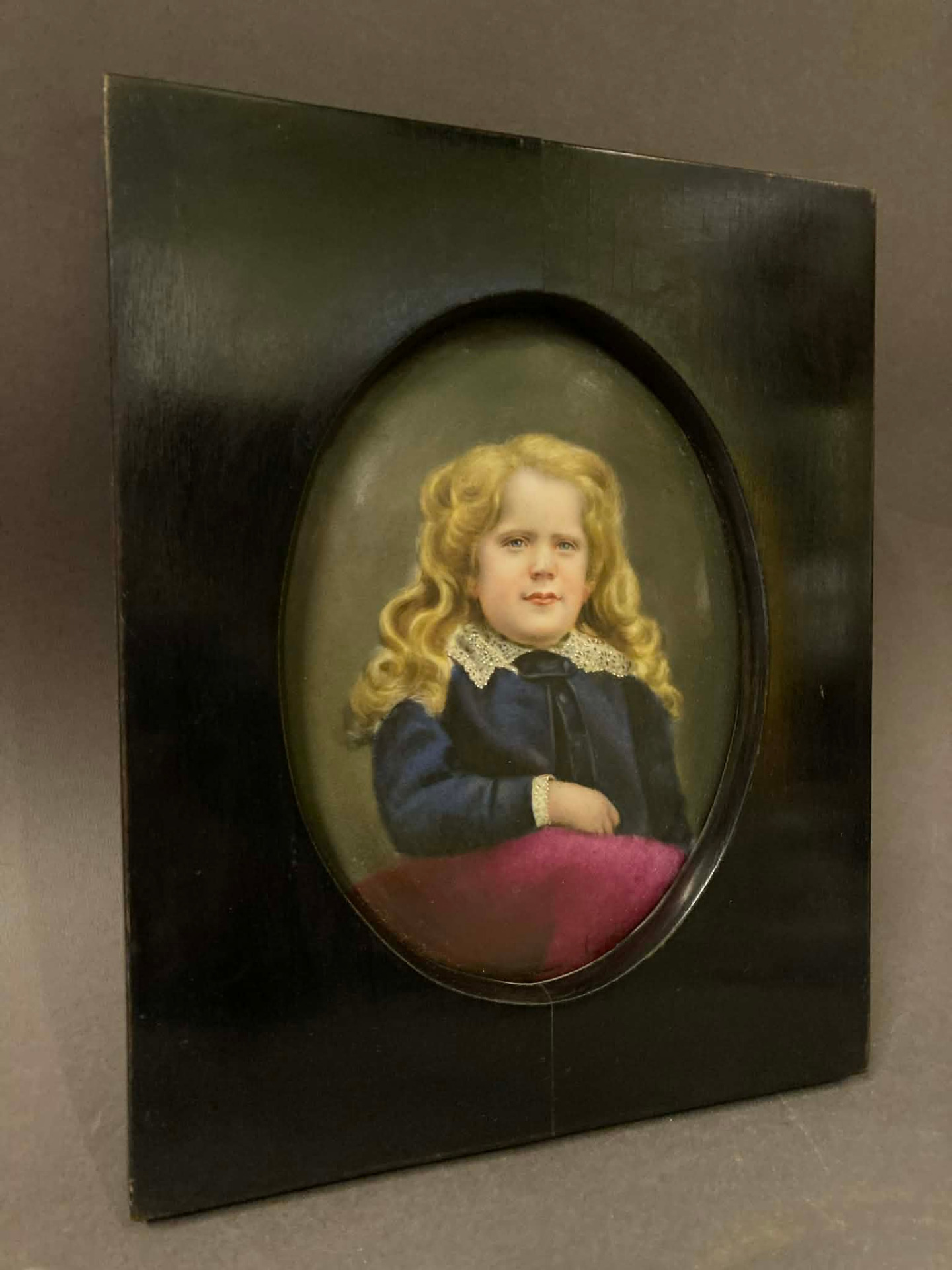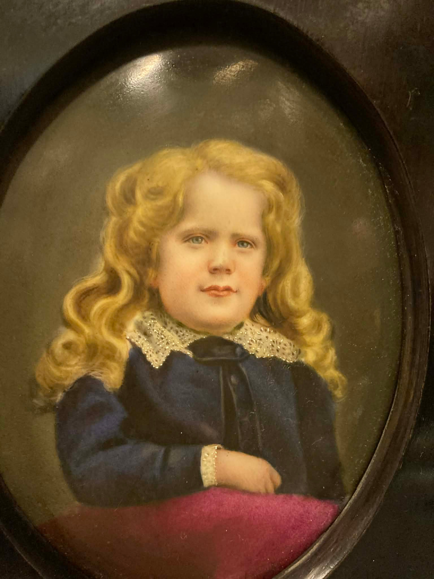 keretezett, jelzett ovál porcelánlapra festett gyermek ábrázolás,
