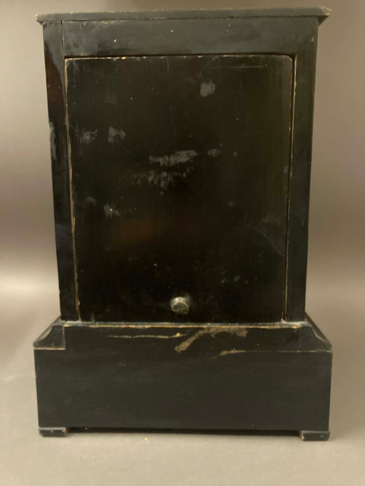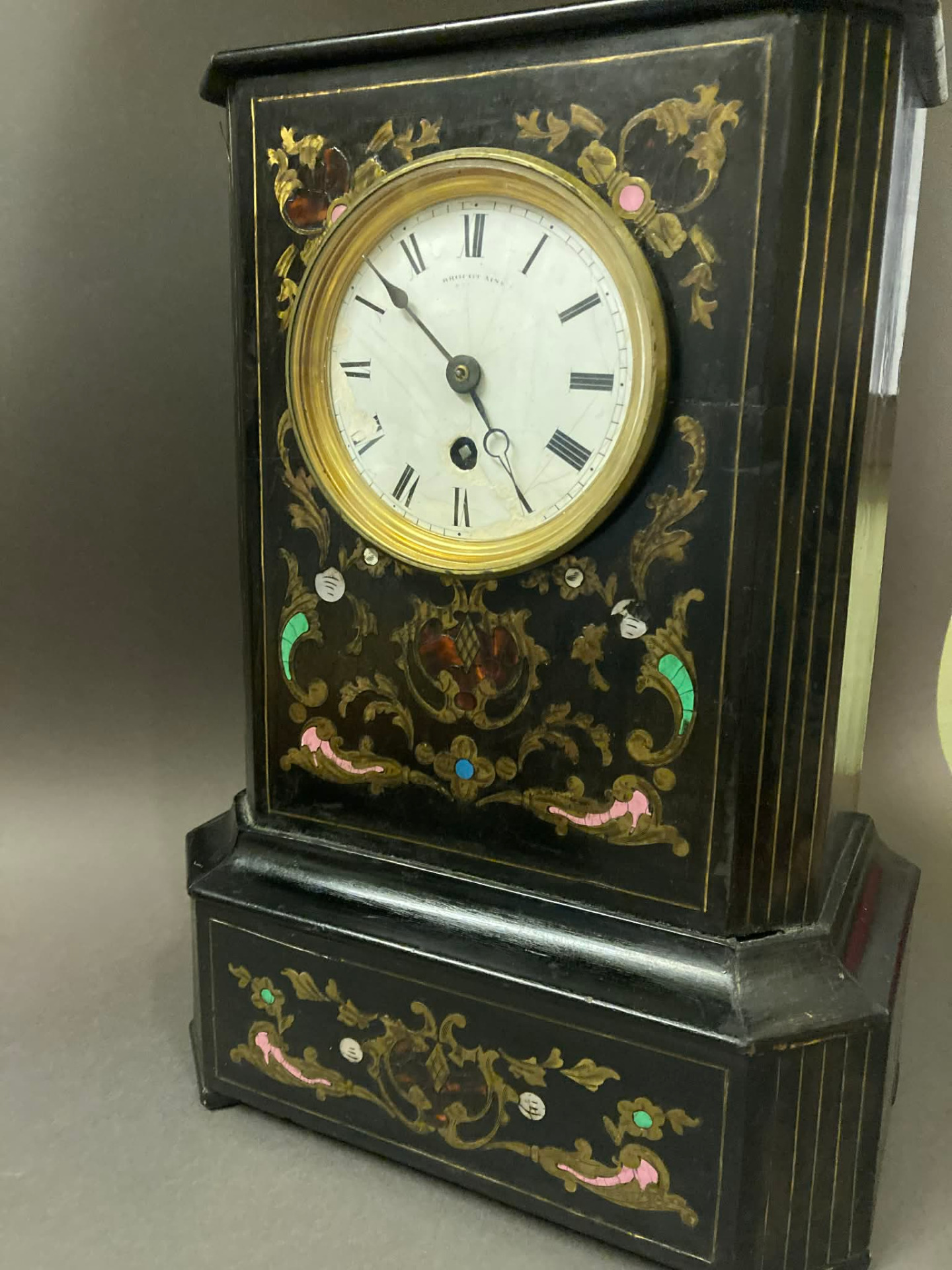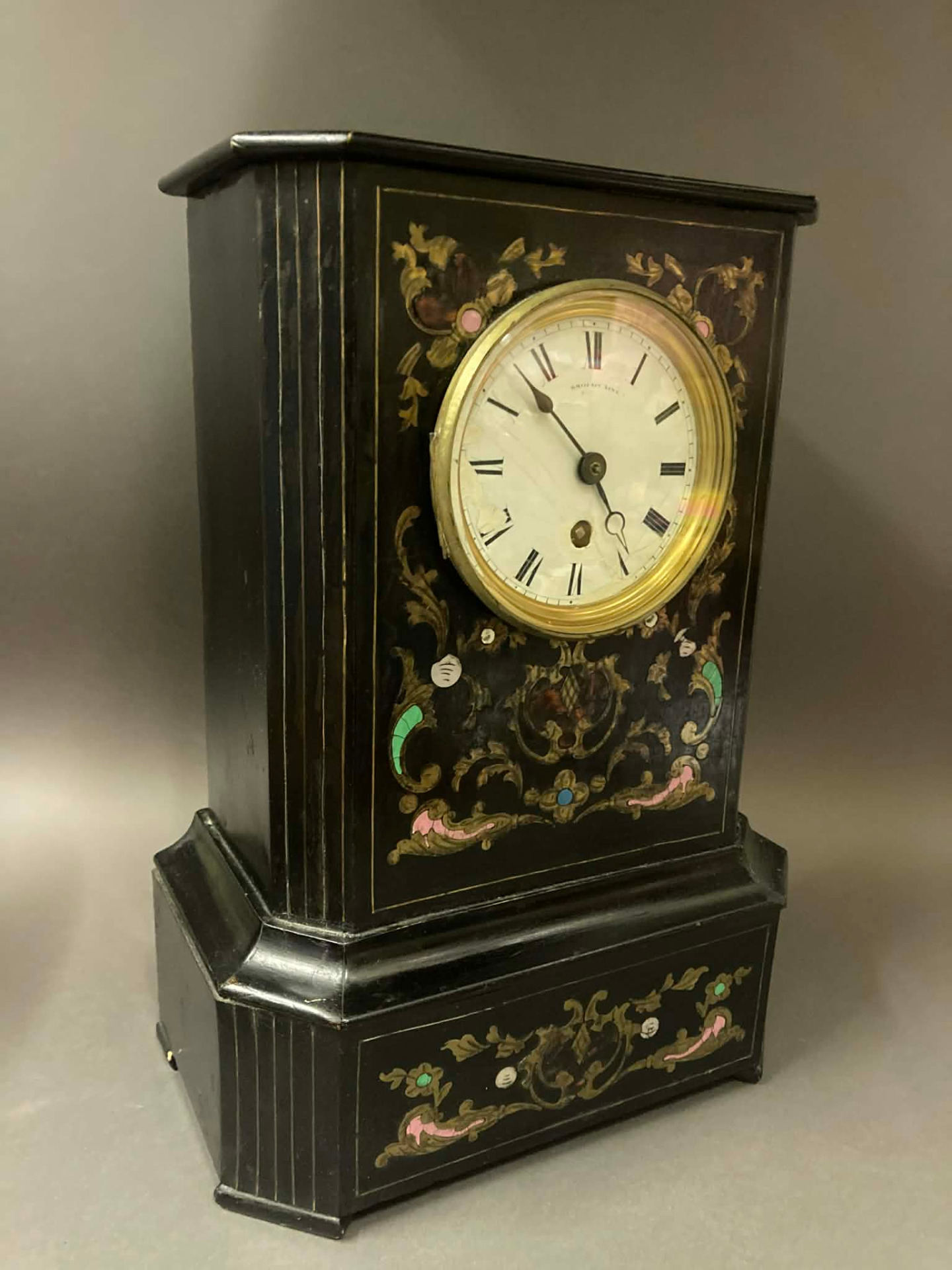 Antik, a tizenkilencedik század elején készülhetett, különleges boulle technikával díszített mechanikus kandalló óra ritkaság. fa tokozatát sárgaréz, zománc és teknőcpáncél berakás teszi igazán különlegessé. Javított zománcozott számlapján felirat foszlány látható, de ebből nem azonosítható a készítő. Mechanikus kulcs felhúzású szerkezete jelenleg nem jár, komplett elindul, de megáll, egy szervizelésre szorul, ha valaki működőképesen szeretné látni. Egy rendkívül különleges, nem kizárható hogy kettőszáz éves kandalló óra birtokosa lehet a megvásárlásával, mely egy neves történelmi családnál teljesített eddig szolgálatot!