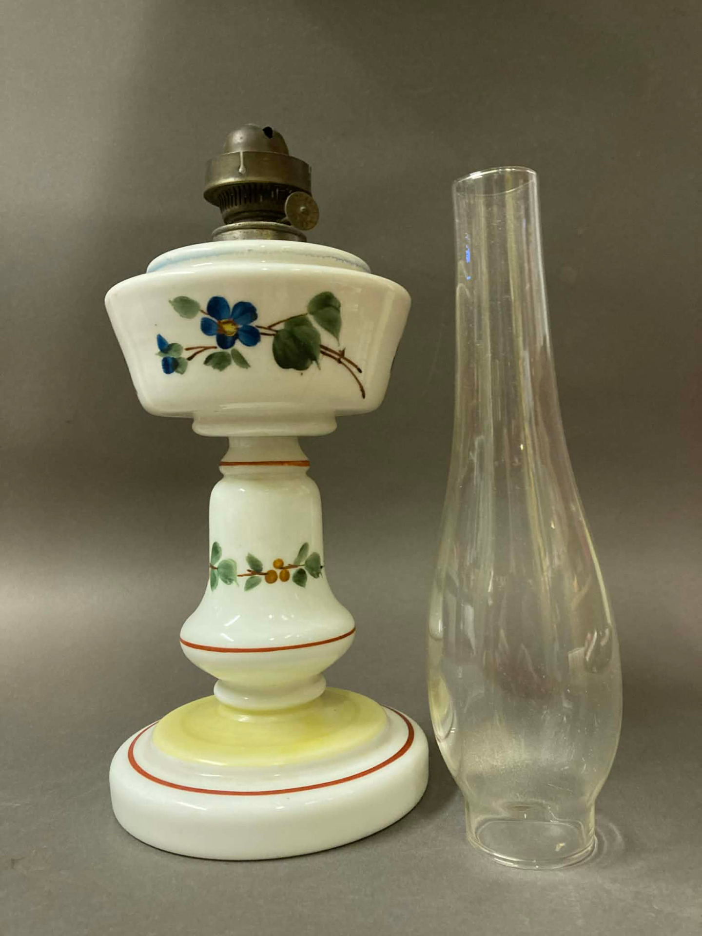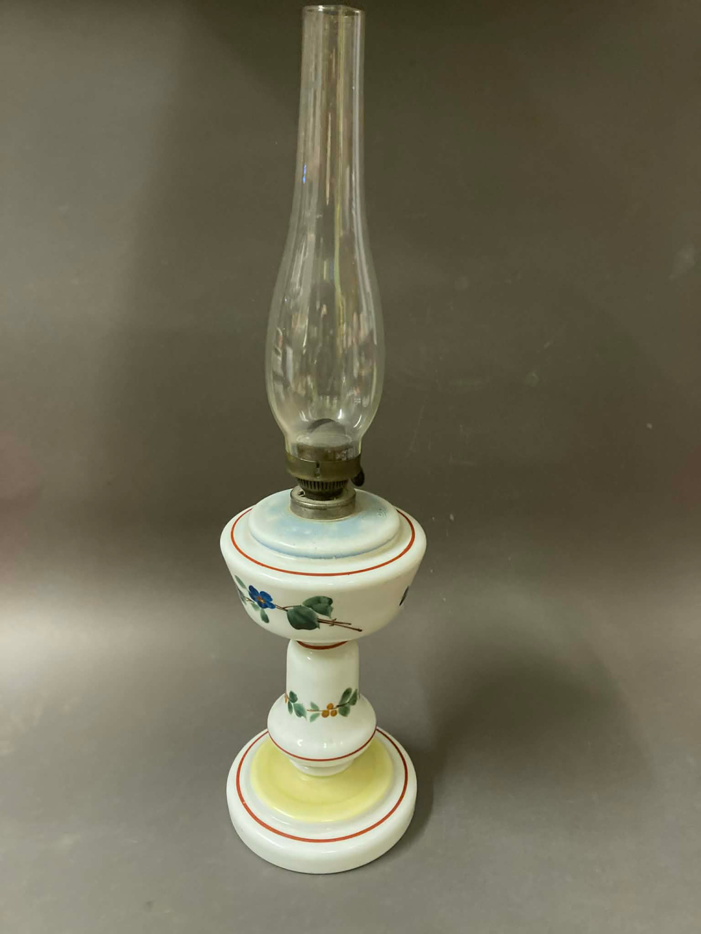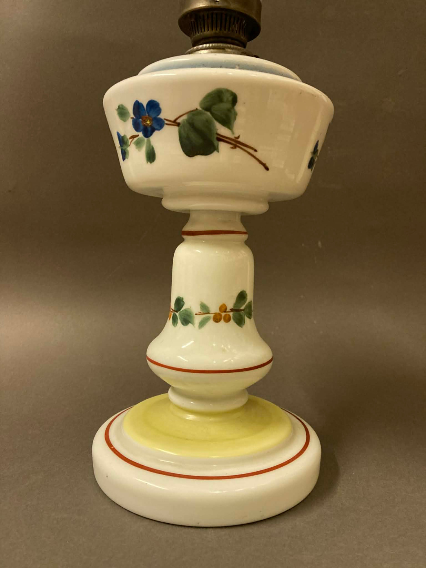 Antik, fújt, festett tejüveg asztali petróleum lámpa