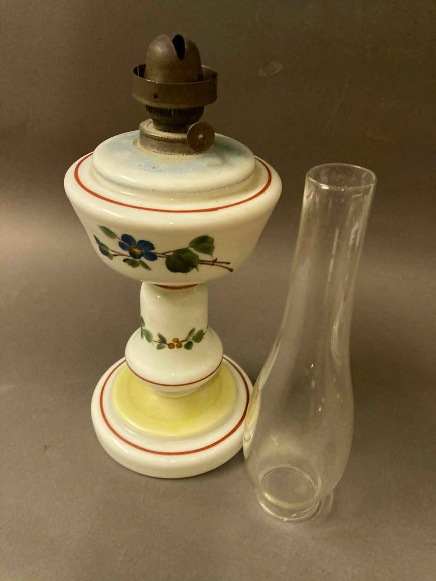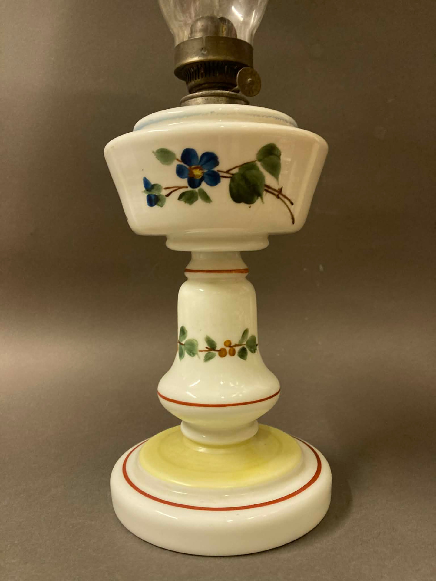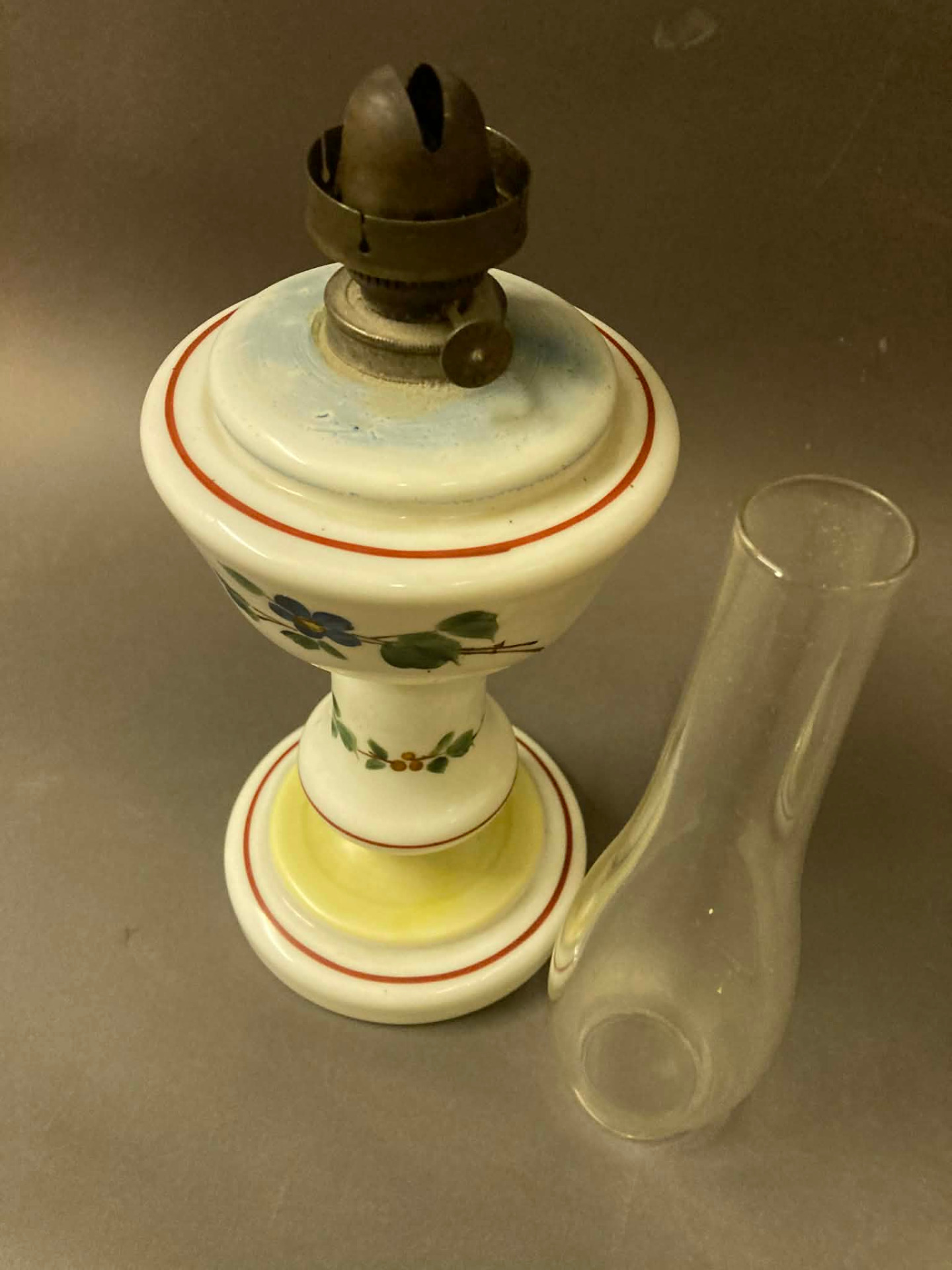 Antik, fújt, festett tejüveg asztali petróleum lámpa