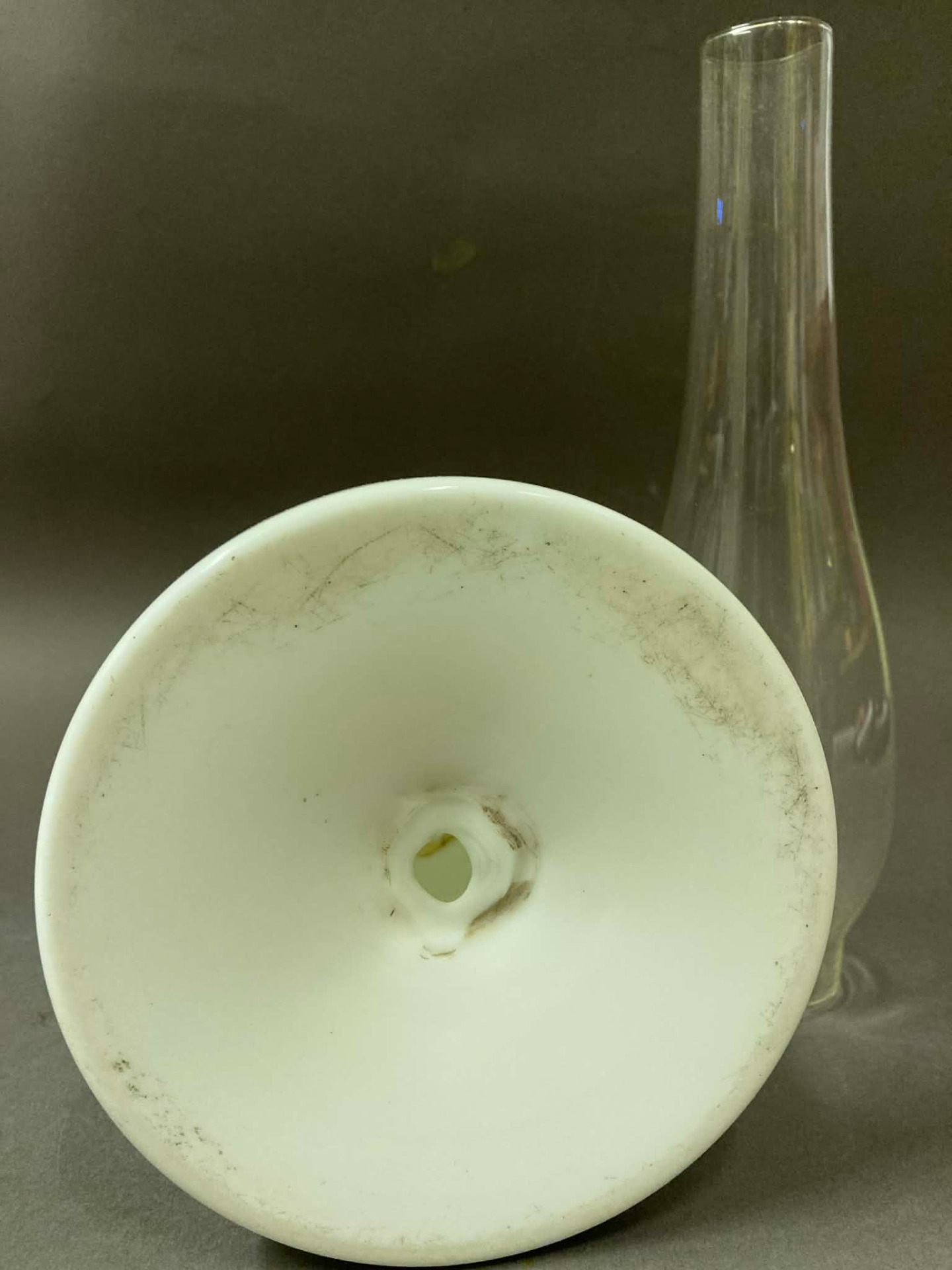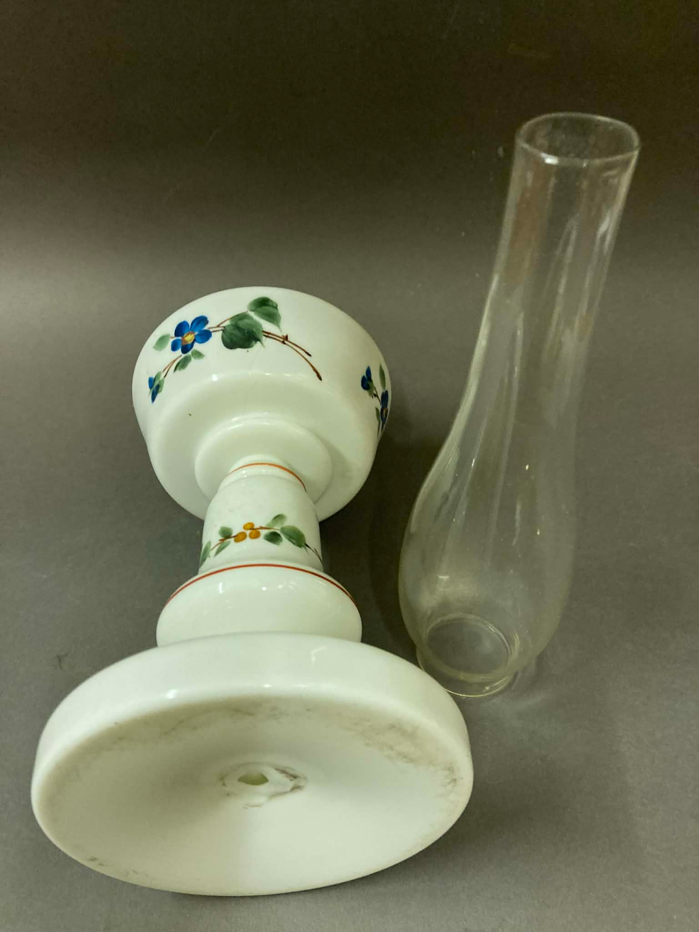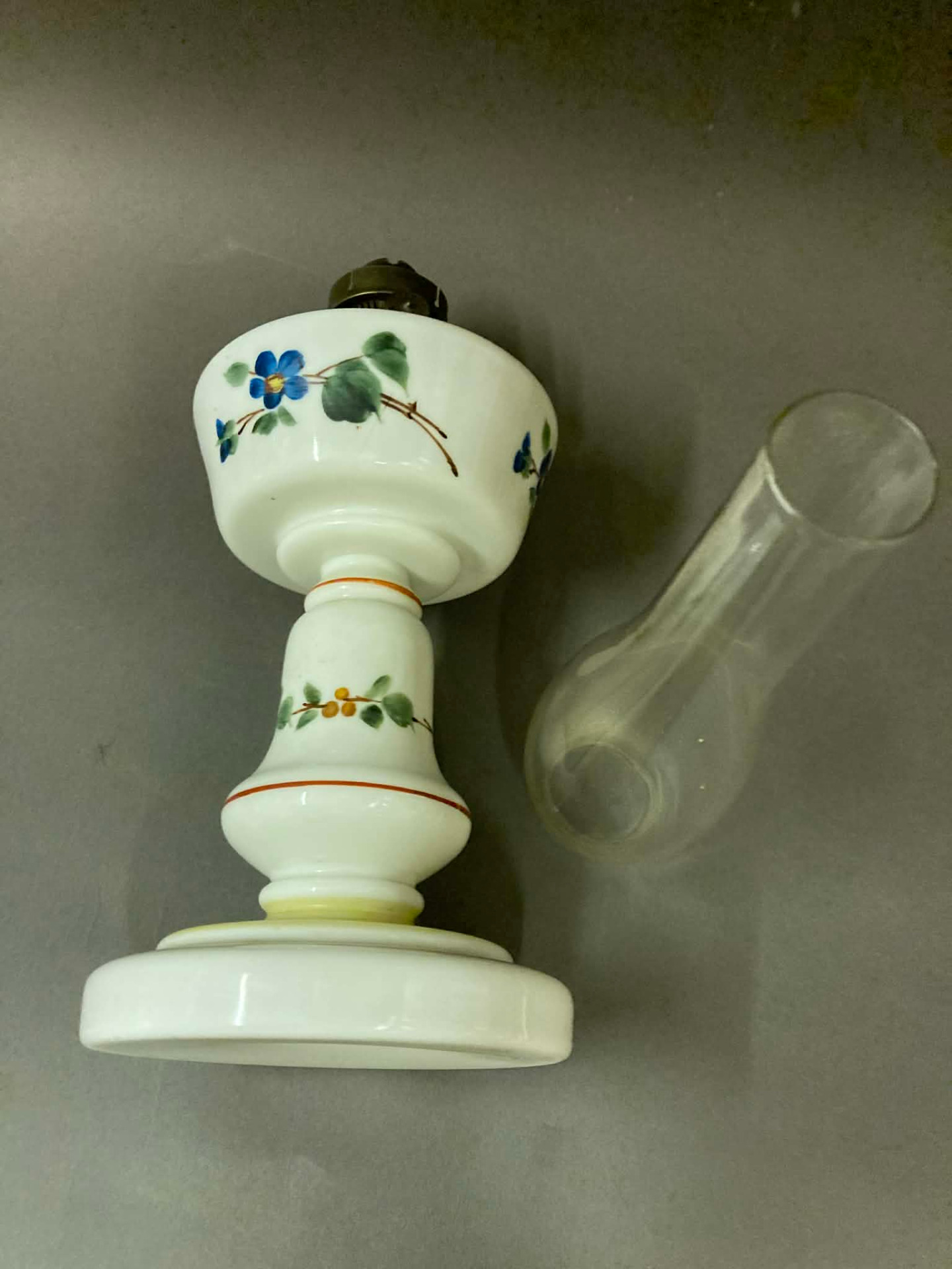 Antik, nagyjából száz éves asztali petróleum lámpa, egy fújt tejüveg test szép kézi festéssel és hibátlan üveg füstcsővel! Remek, eredeti állapotban!