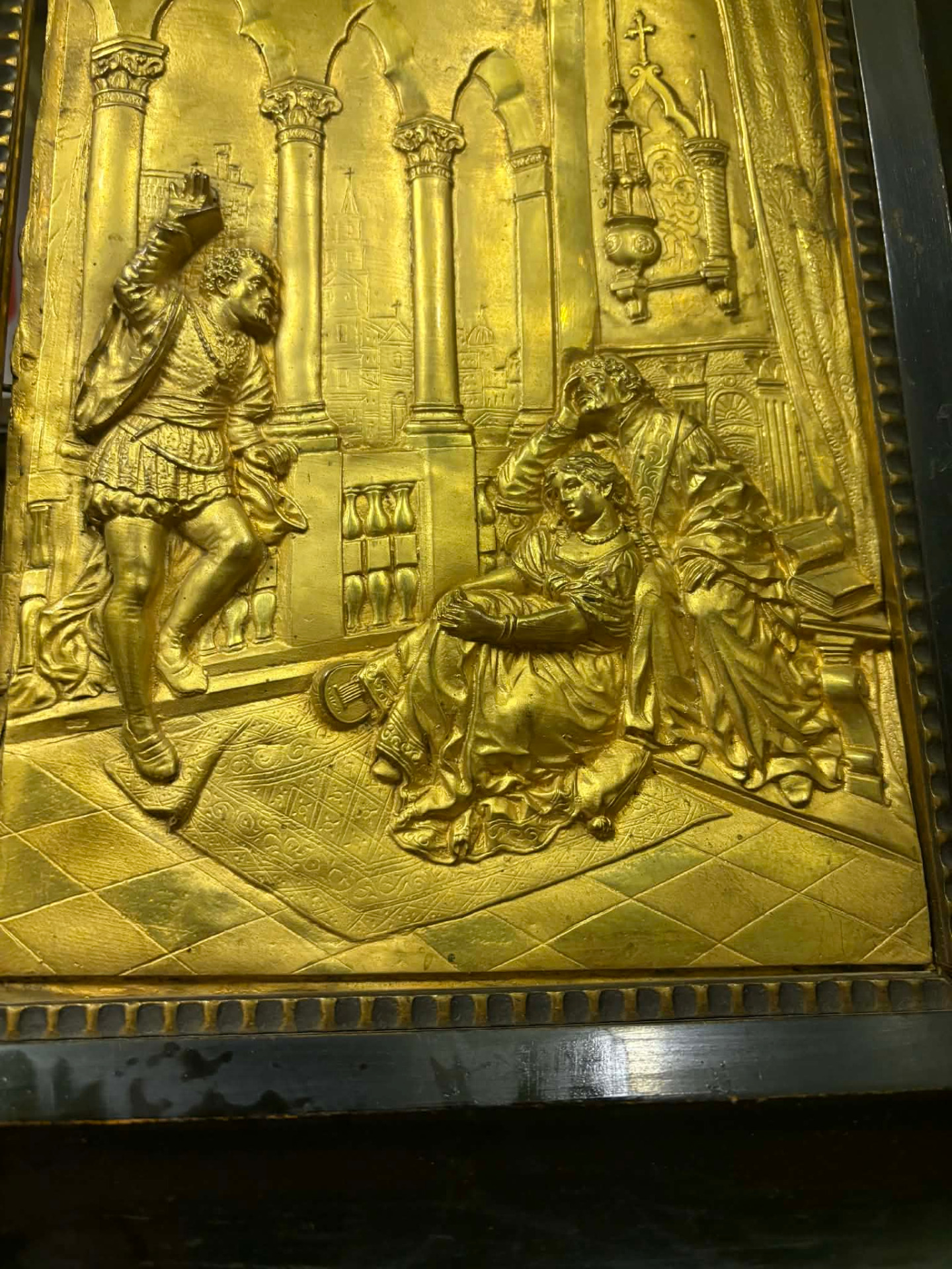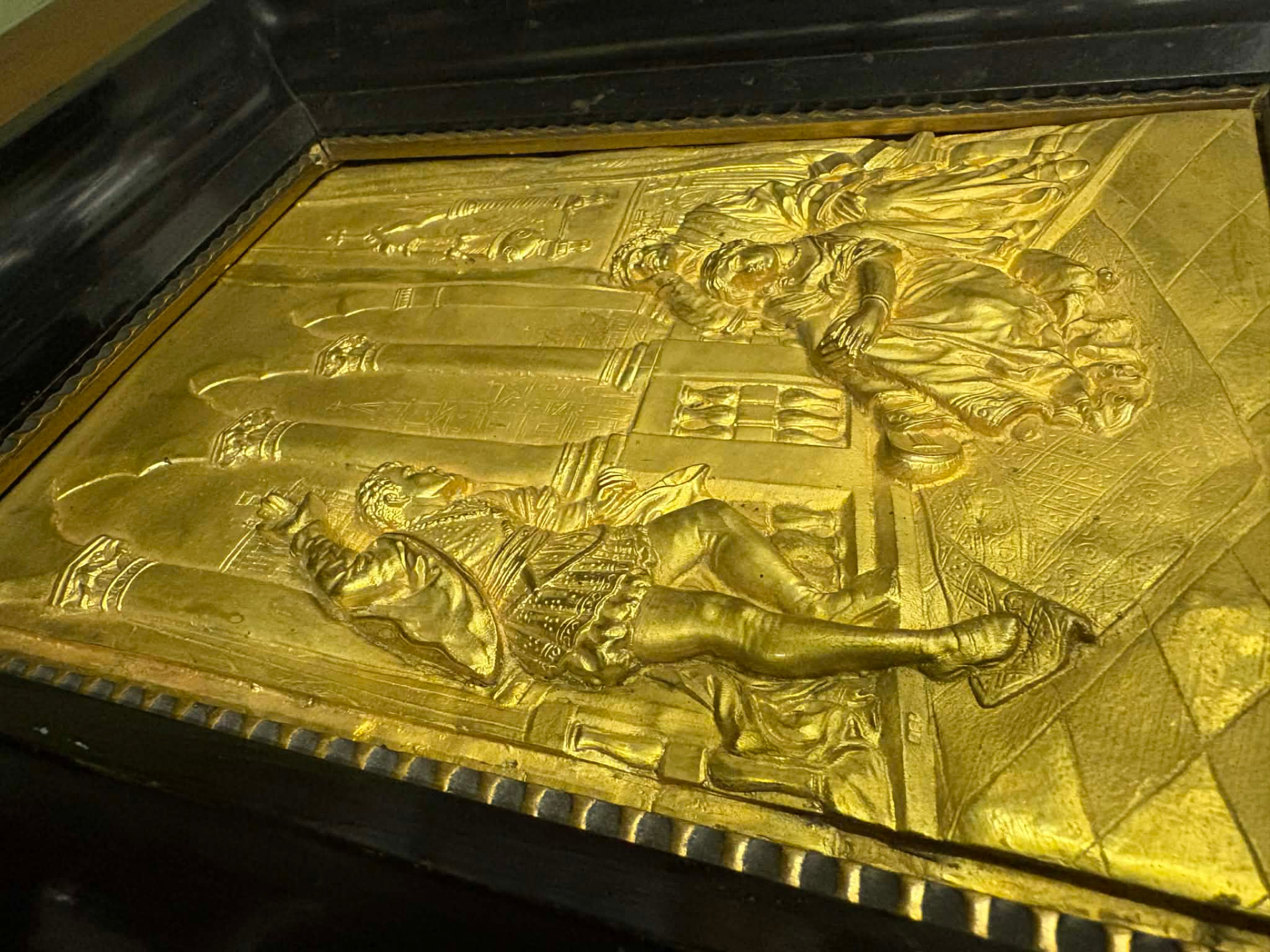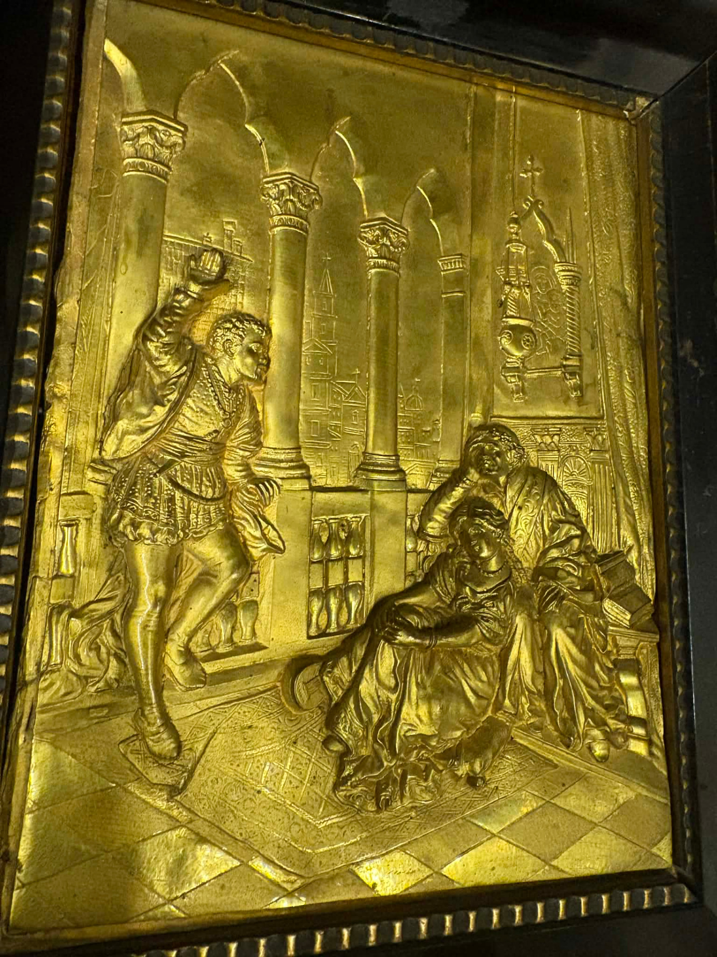 Antik, a XIX sz. második felében készülhetett, nyugat-európai munka. Tűzaranyozott domborított rézlemez, relief. Rendkívül aprólékos professzionális munka, korabeli fekete fa keretében.