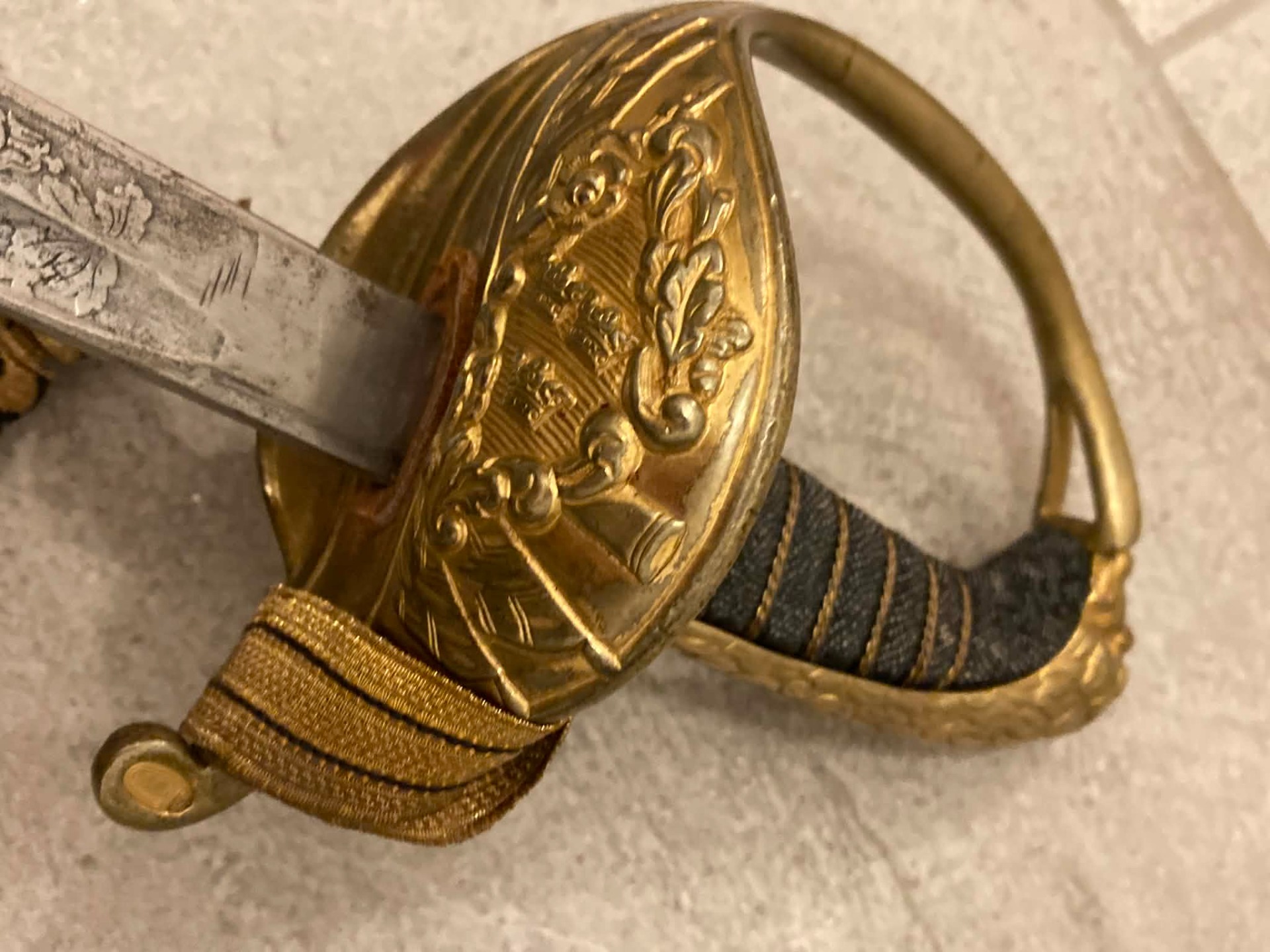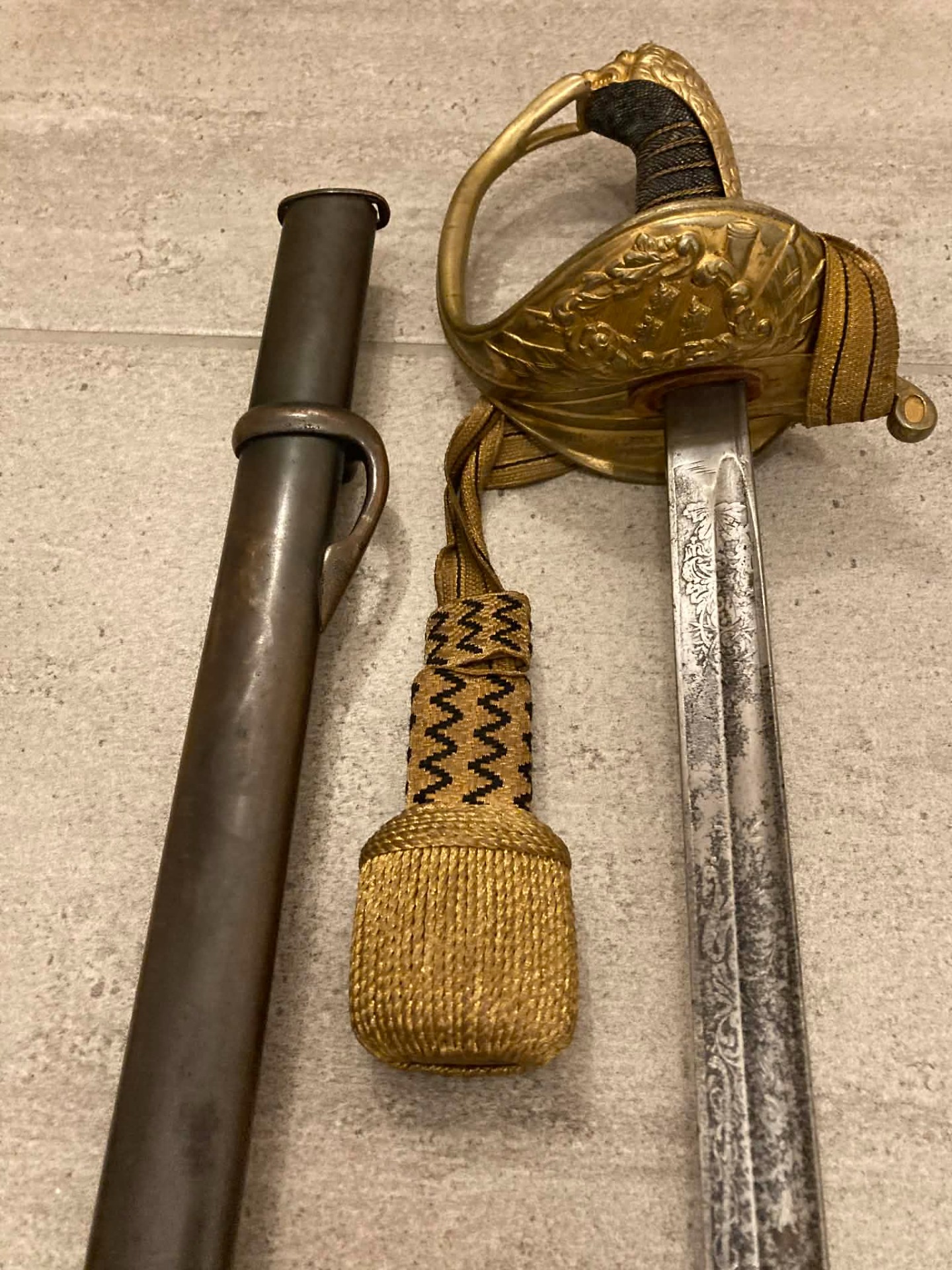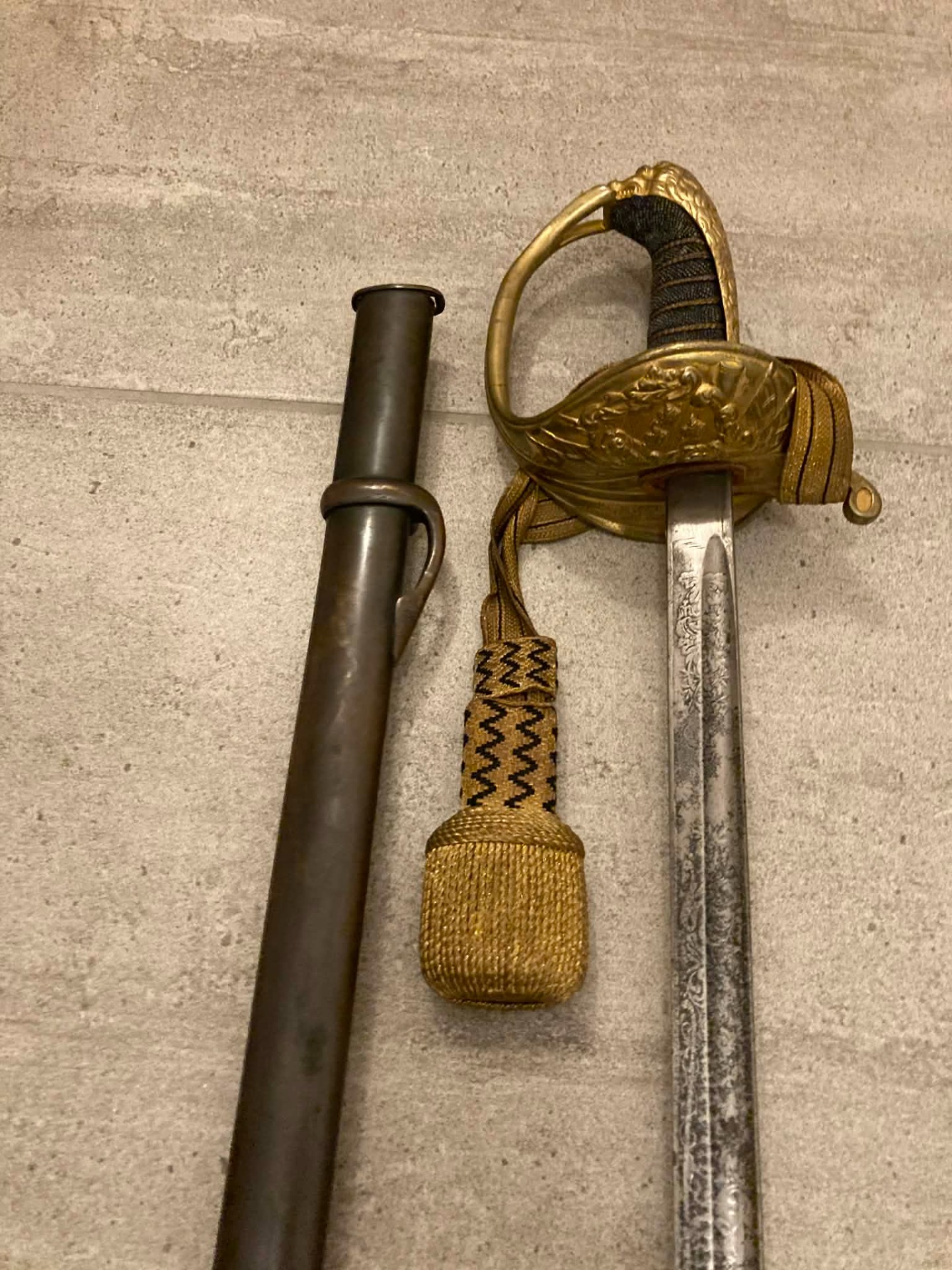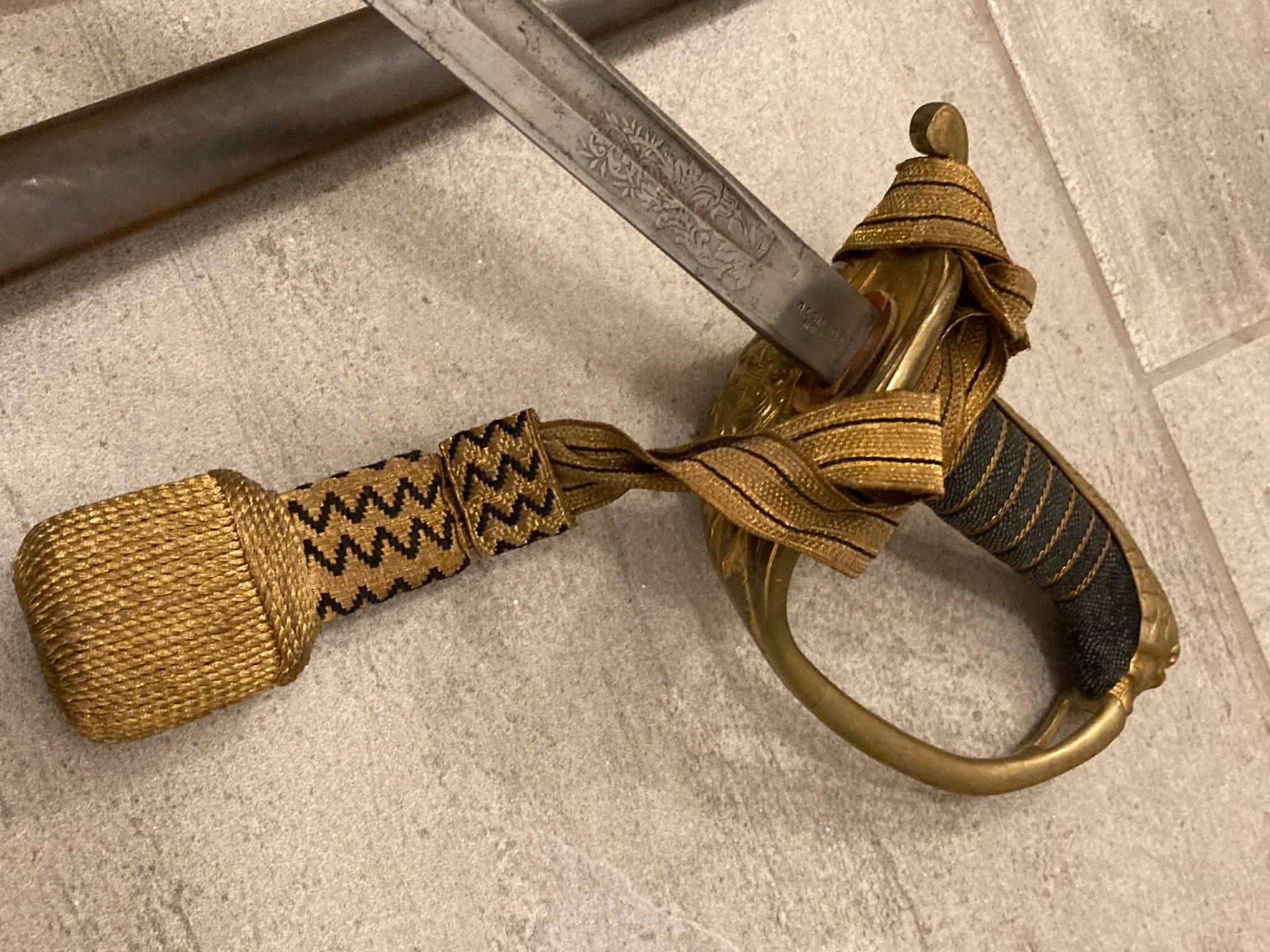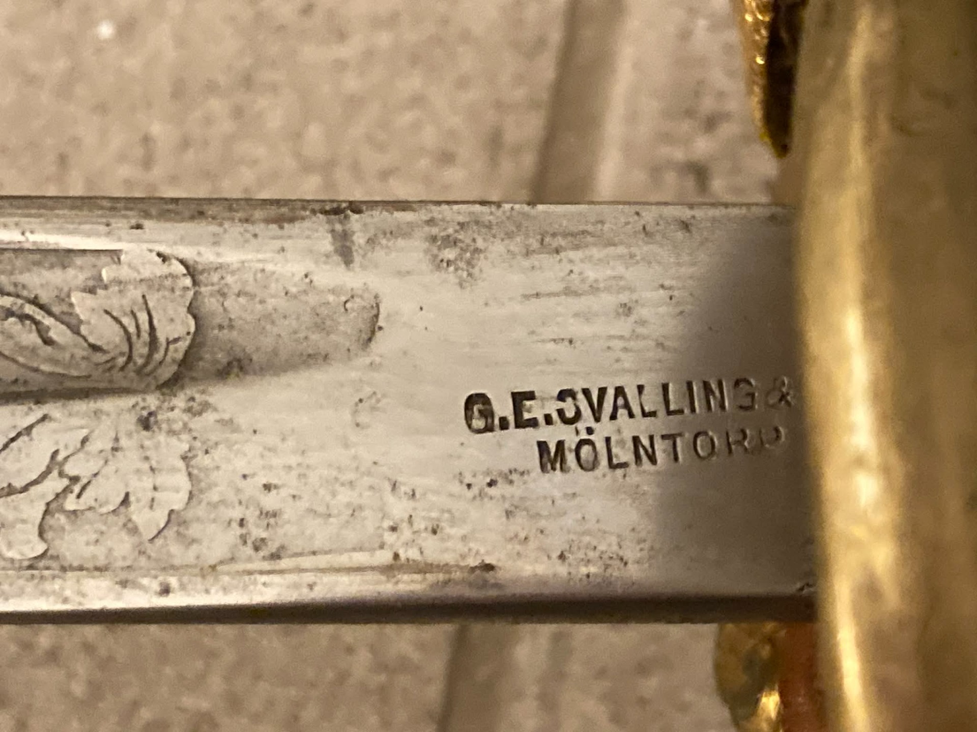 Antik, véleményünk és elérhető adatbázisok alapján az 1800-as évek második felében készült svéd gyalogtiszti kard, hüvelyében, kardbojttal, remek állapotban megőrizve! Oroszlános rájabőr sárgaréz markolattal, díszes jelzett pengével mattított hüvelyében, markolat védőjén a három koronás svéd címerpajzs látható! Díszes pengéjén a neves svéd gyártó, a Mölntorpban működő G.E. Svalling & Co beütött cégjele olvasható! Csodaszép darab, mely remek dekoráció és komoly gyűjtői példány is egyben!