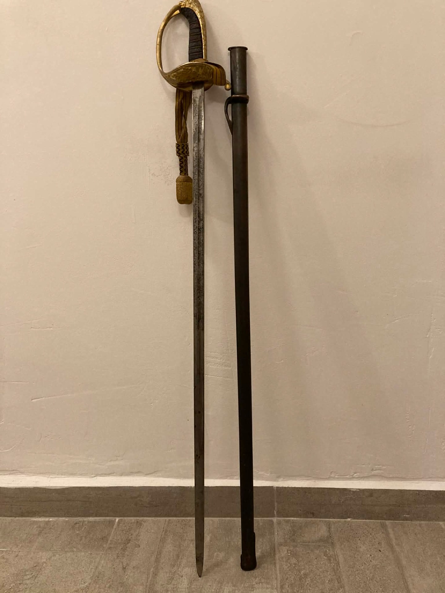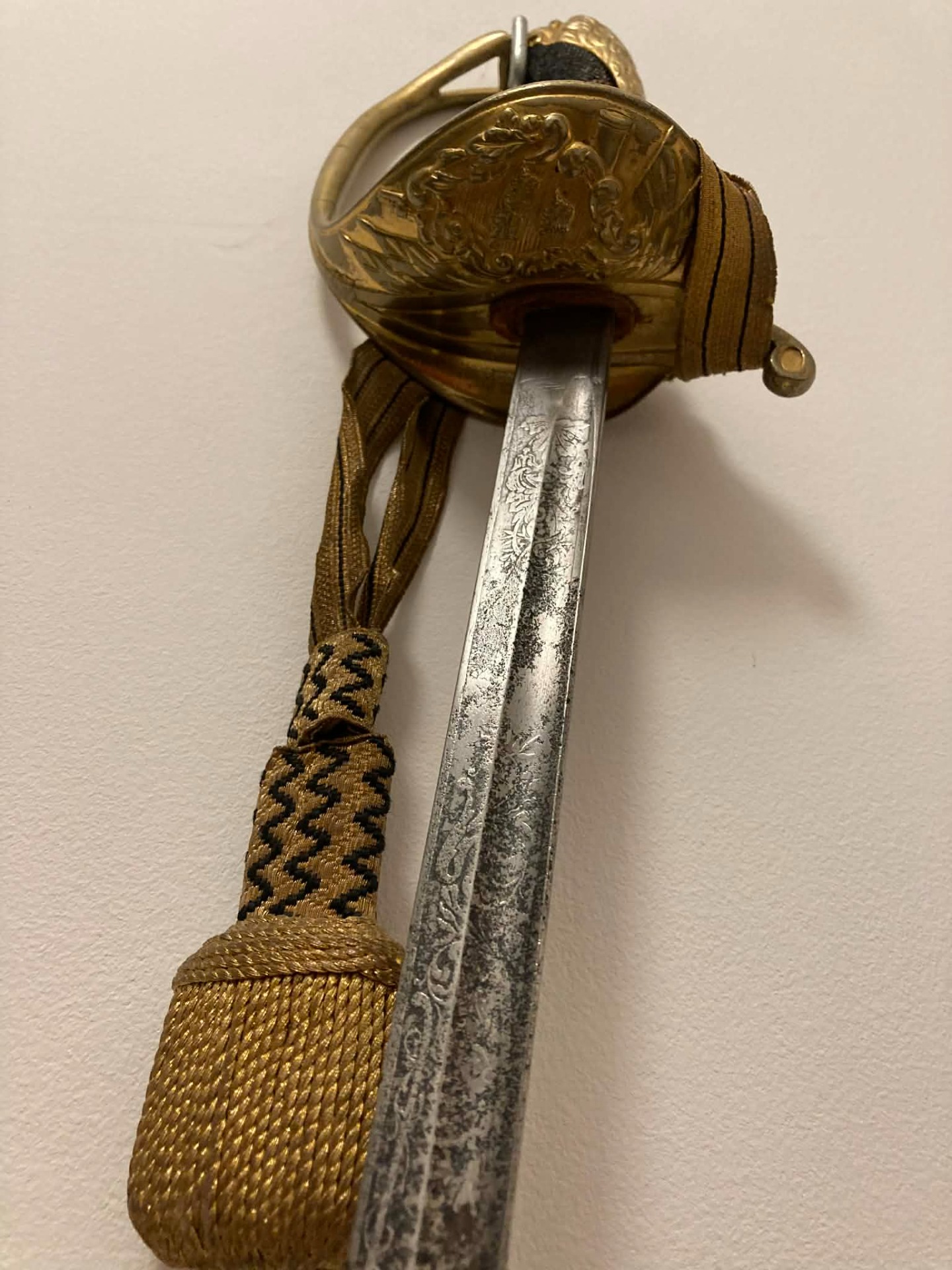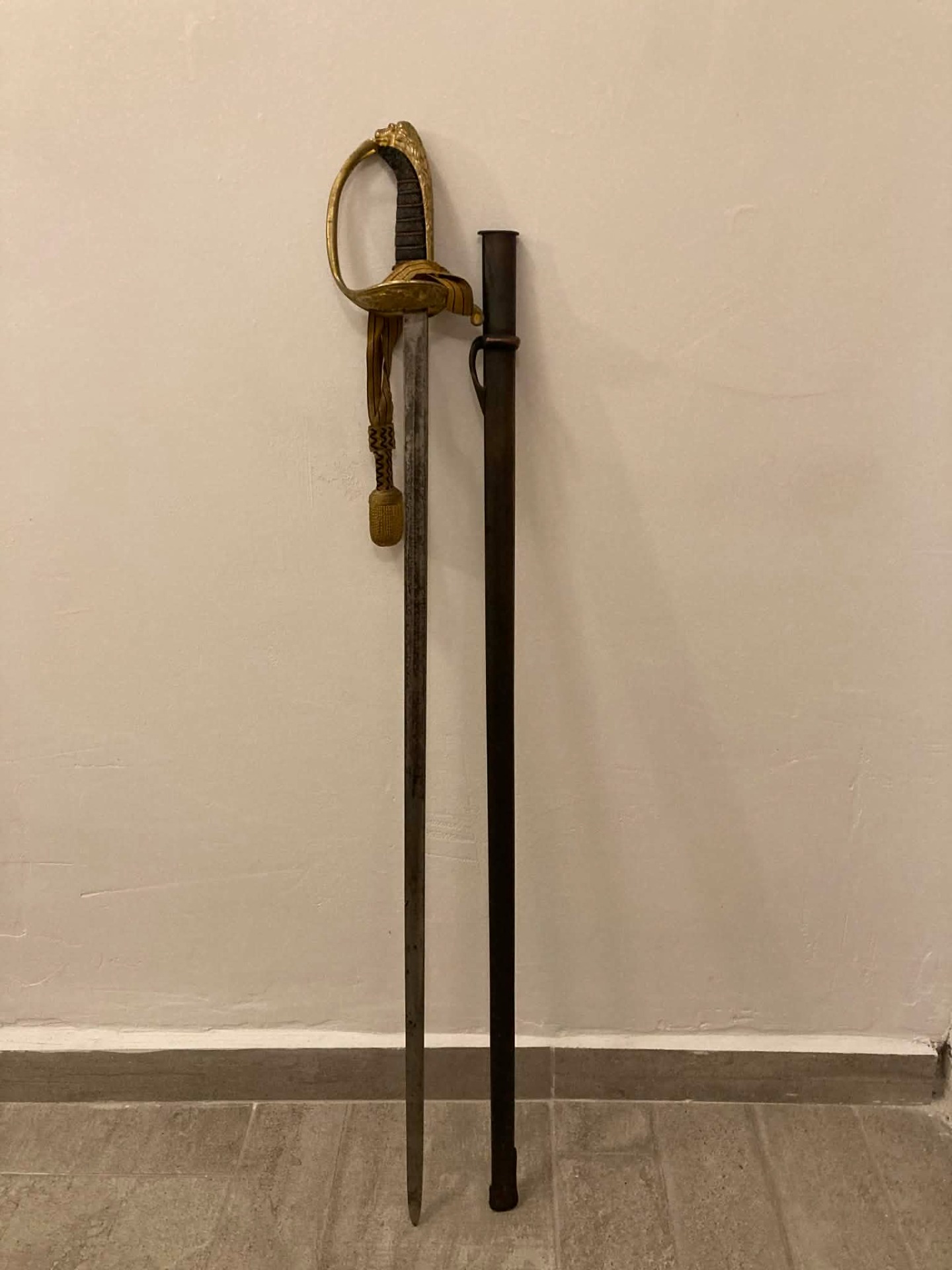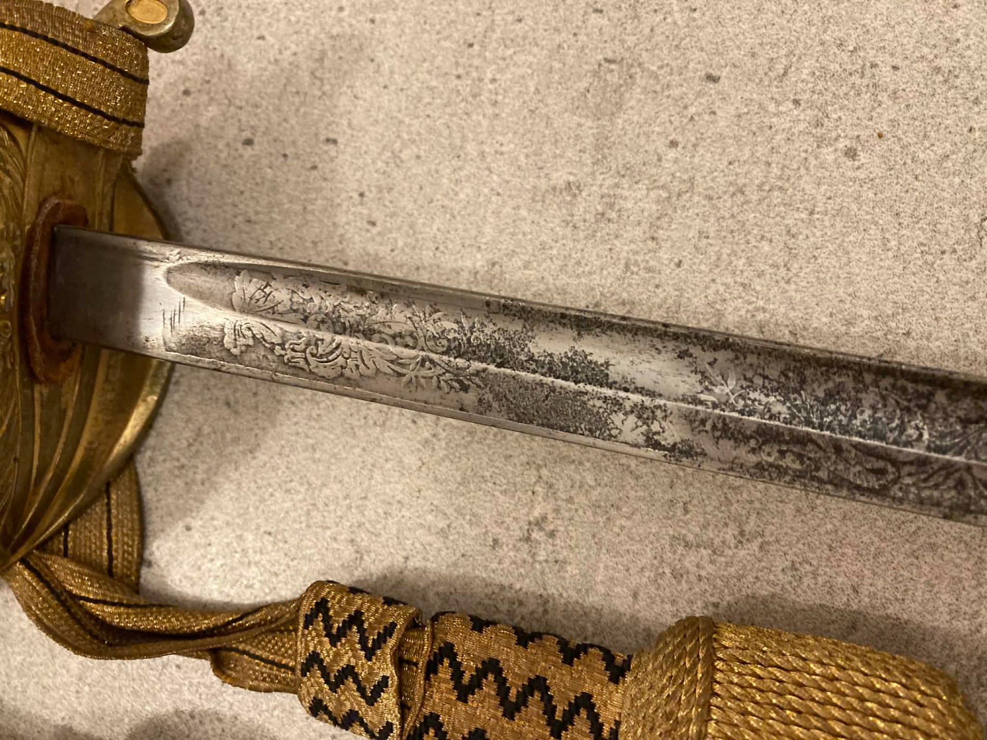 Antik, véleményünk és elérhető adatbázisok alapján az 1800-as évek második felében készült svéd gyalogtiszti kard, hüvelyében, kardbojttal, remek állapotban megőrizve! Oroszlános rájabőr sárgaréz markolattal, díszes jelzett pengével mattított hüvelyében, markolat védőjén a három koronás svéd címerpajzs látható! Díszes pengéjén a neves svéd gyártó, a Mölntorpban működő G.E. Svalling & Co beütött cégjele olvasható! Csodaszép darab, mely remek dekoráció és komoly gyűjtői példány is egyben!
