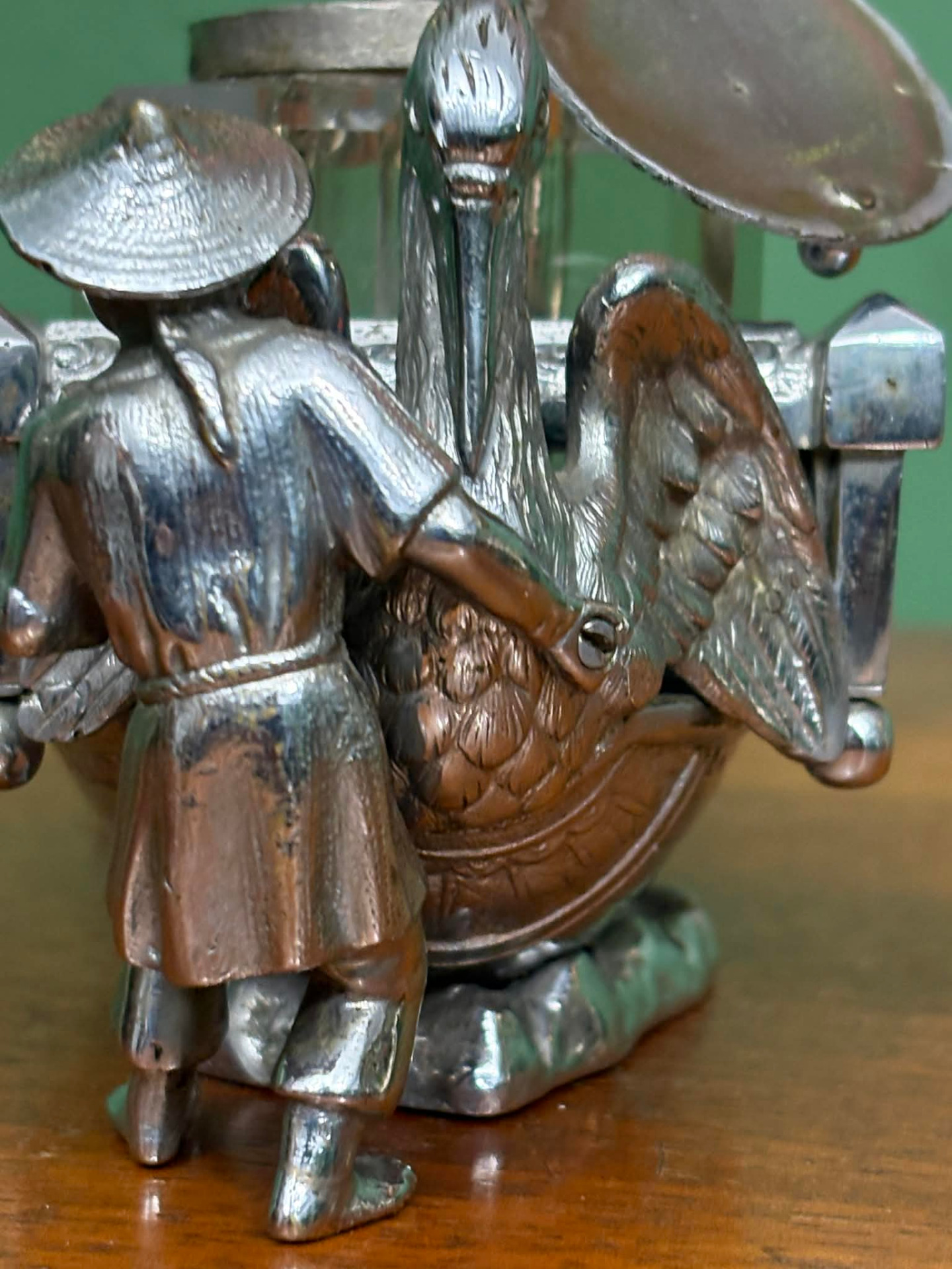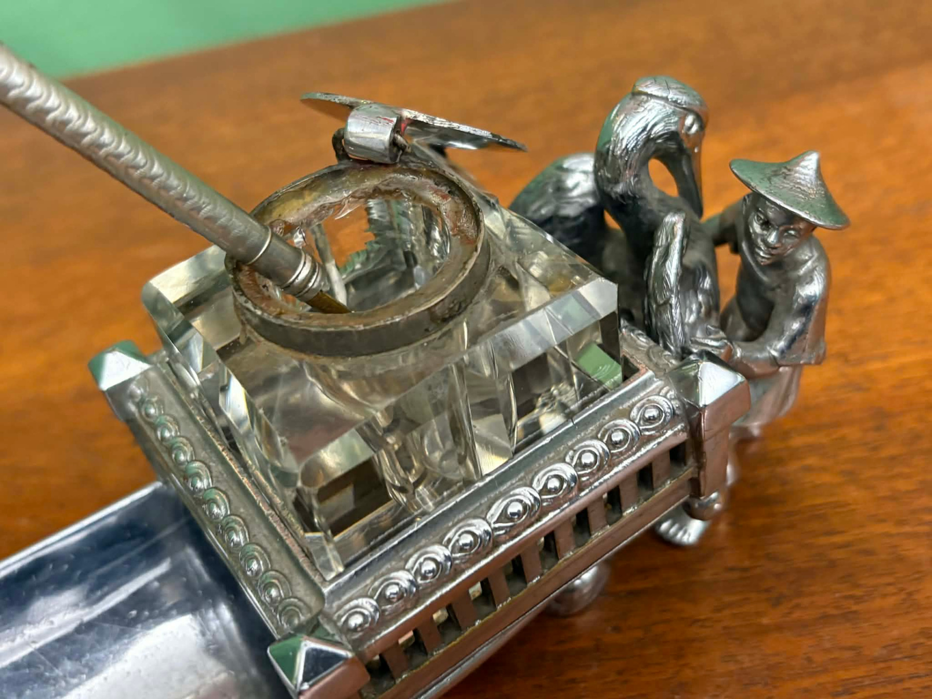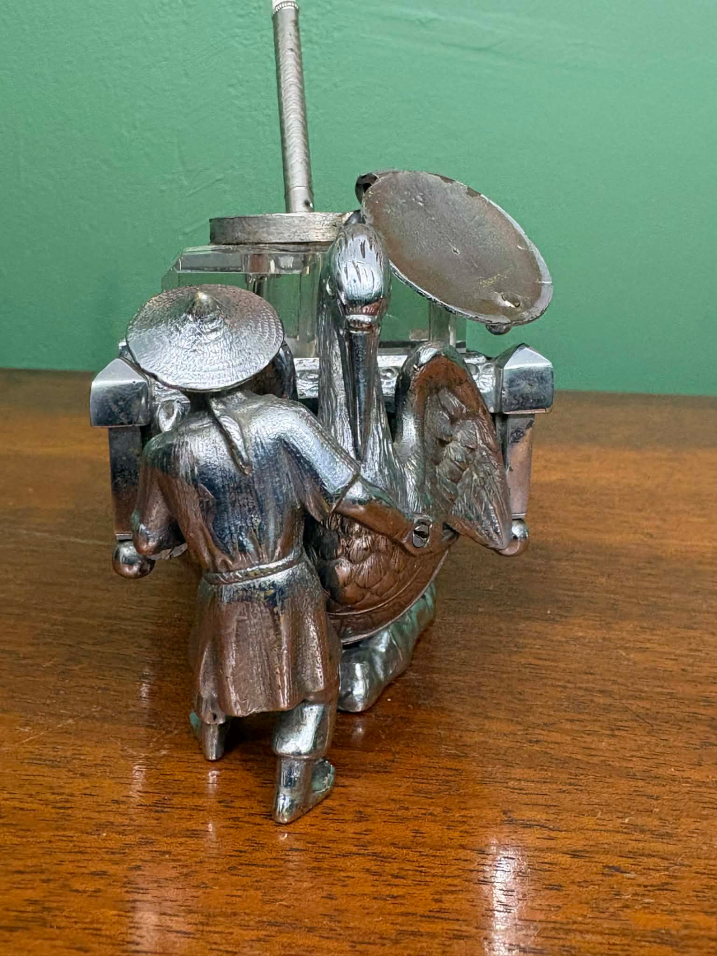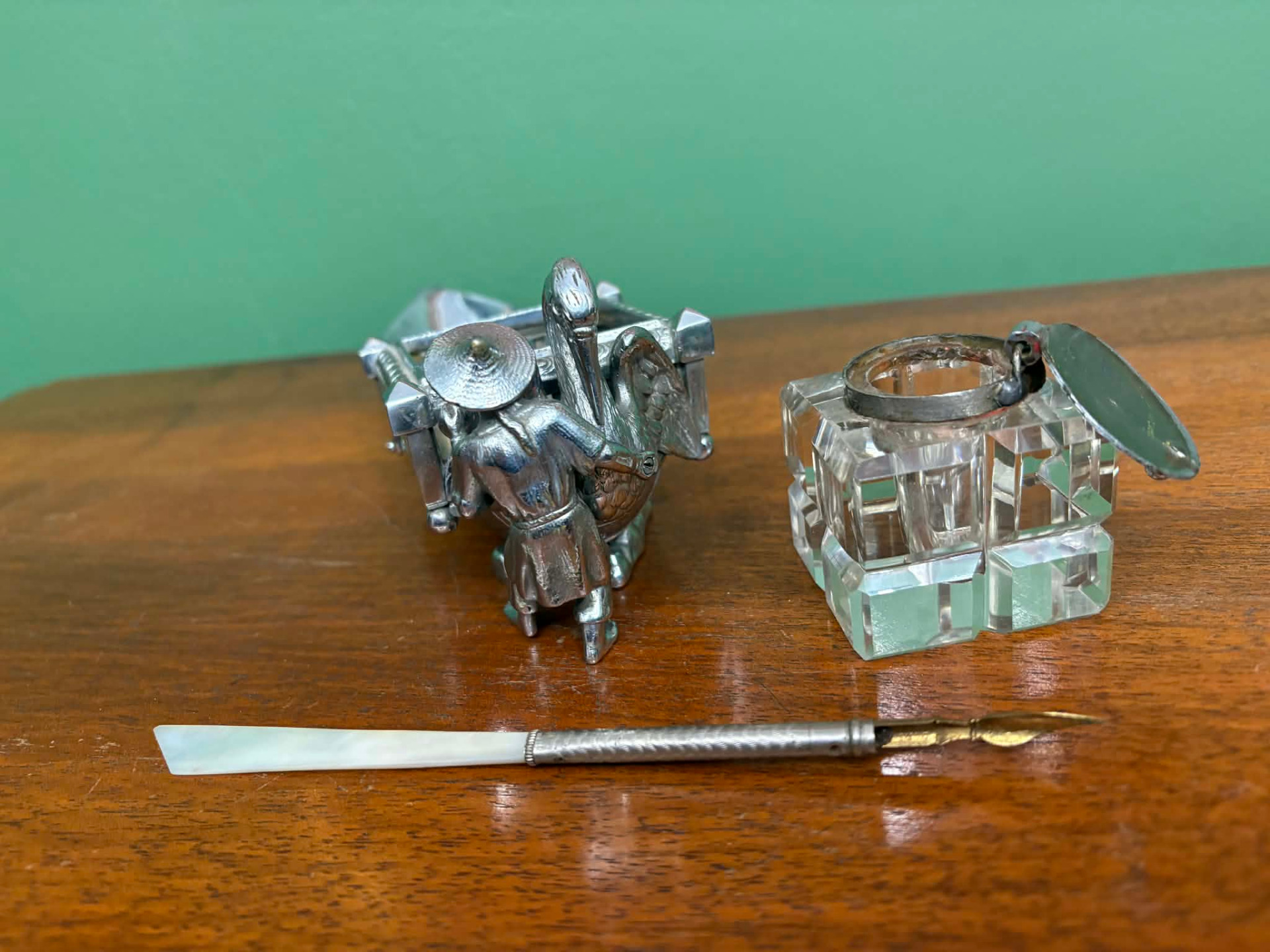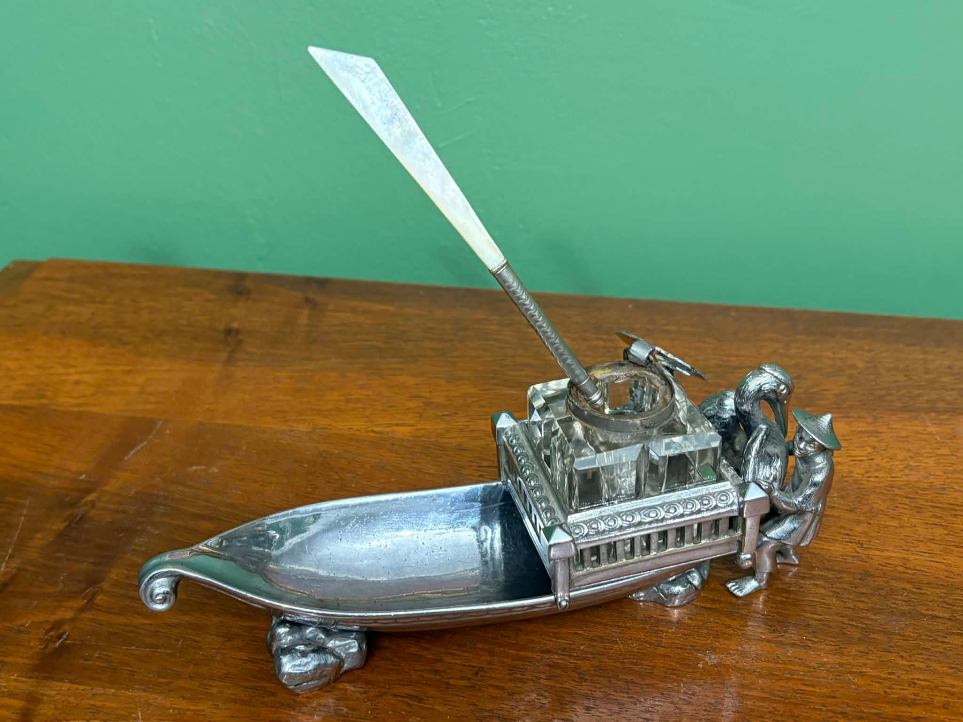 életképpel megformált íróasztal dísz, tintatartó kalamáris, toll és