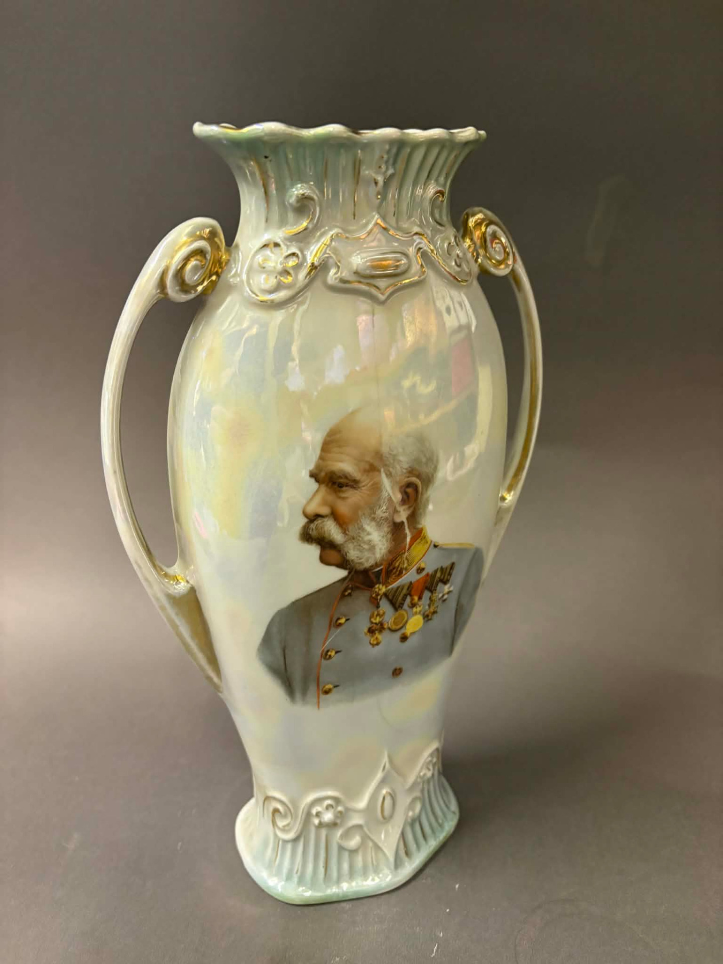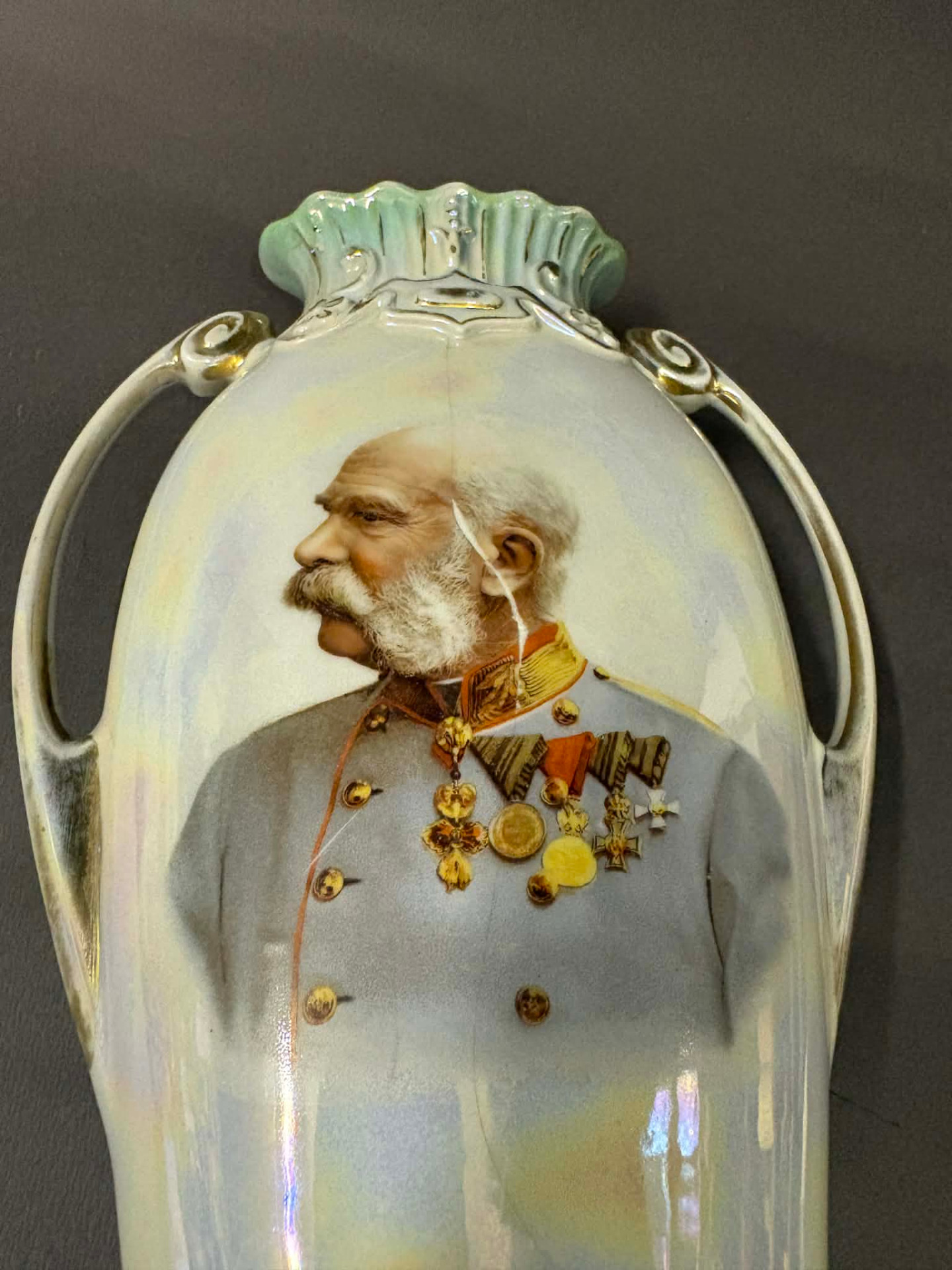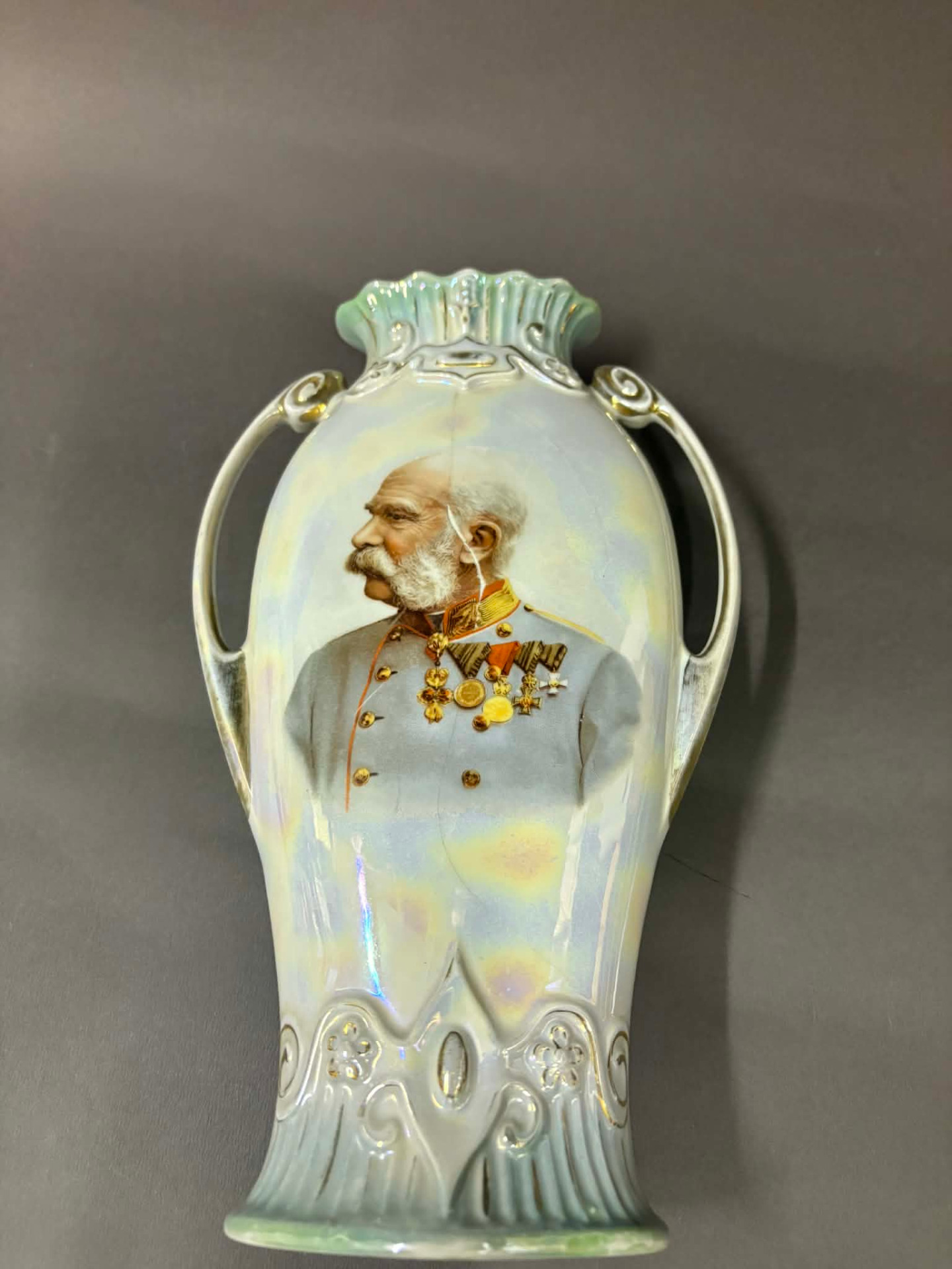 irizáló porcelán, melynek frontján nagy méretű képen I. Ferenc József