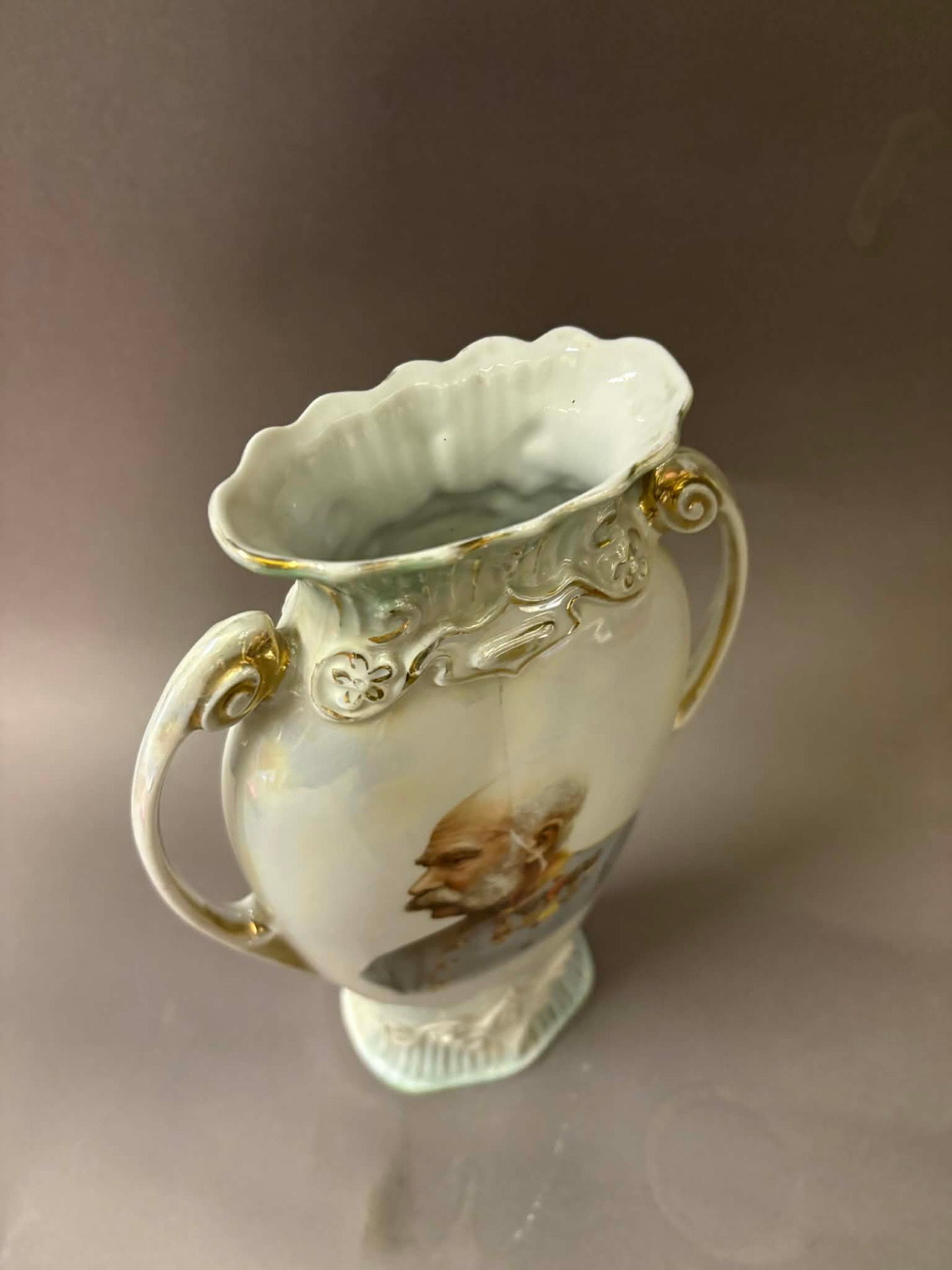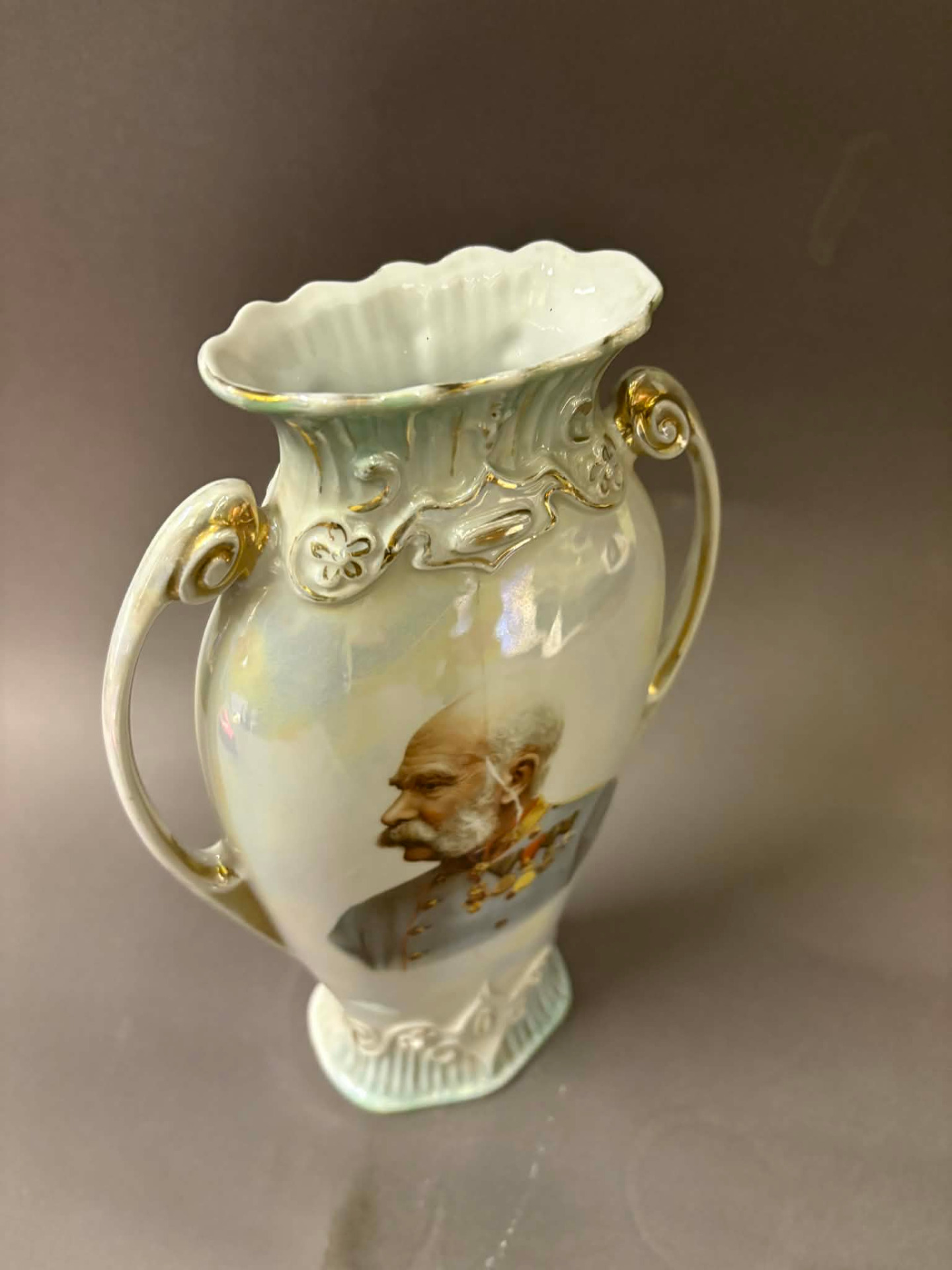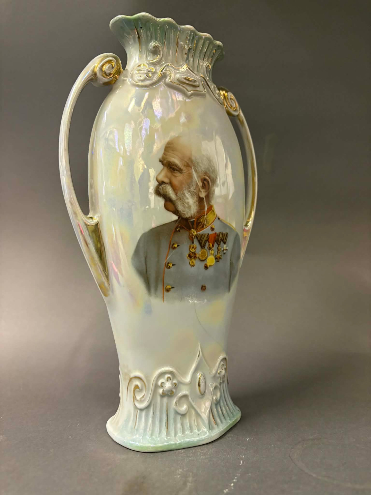 irizáló porcelán, melynek frontján nagy méretű képen I. Ferenc József