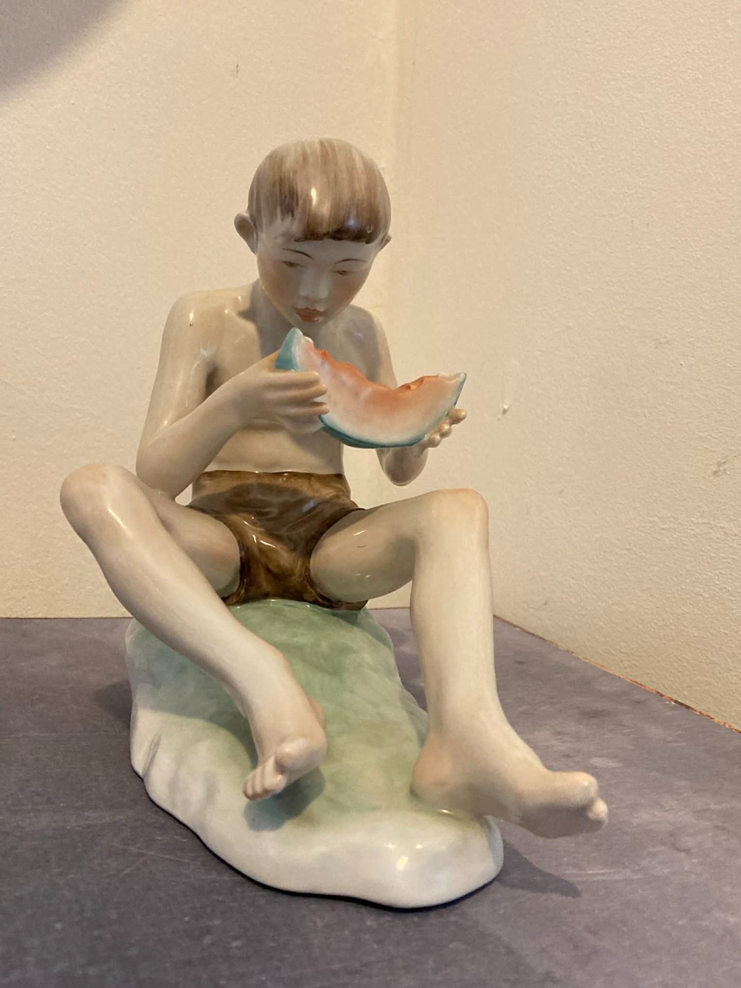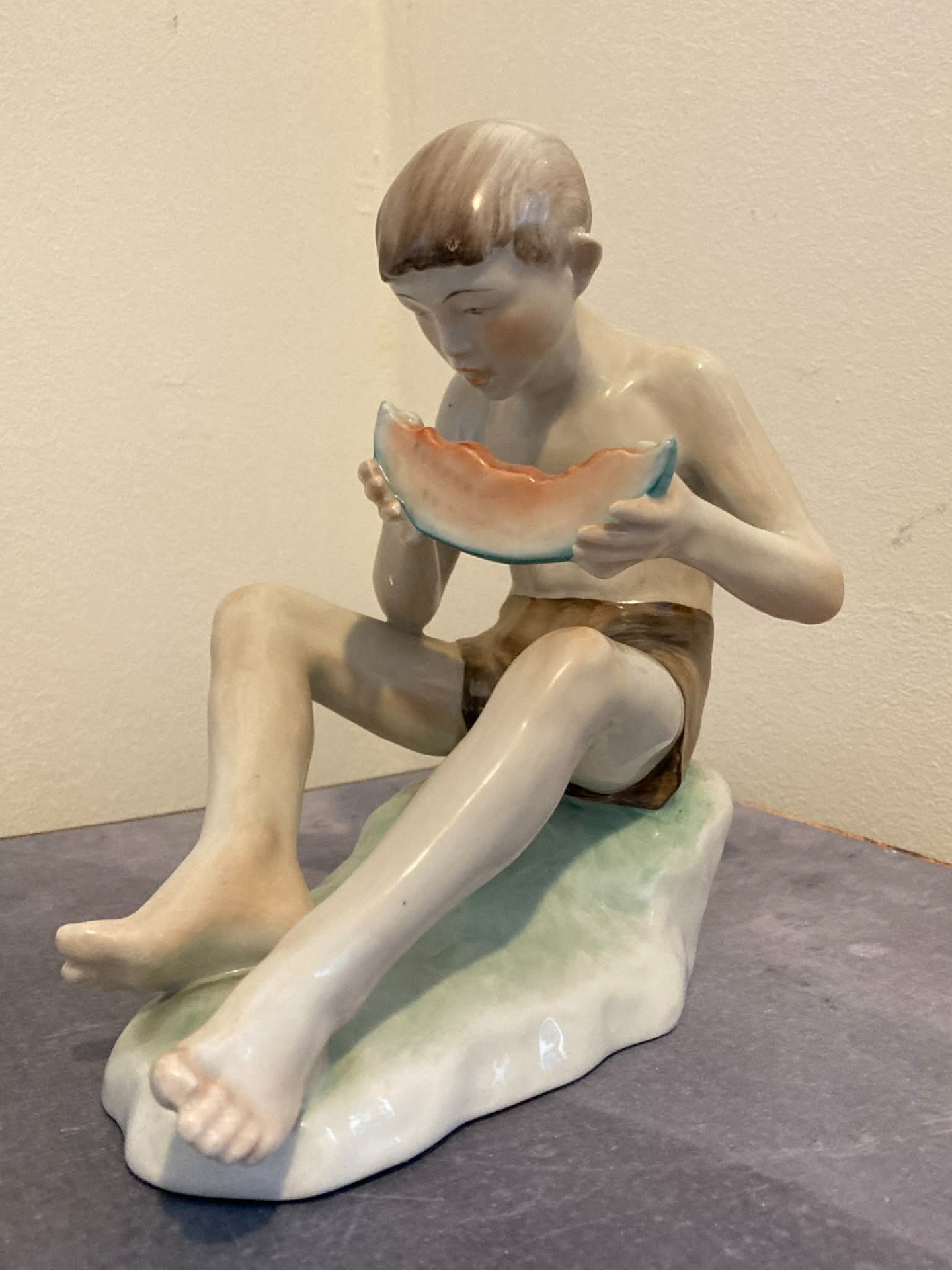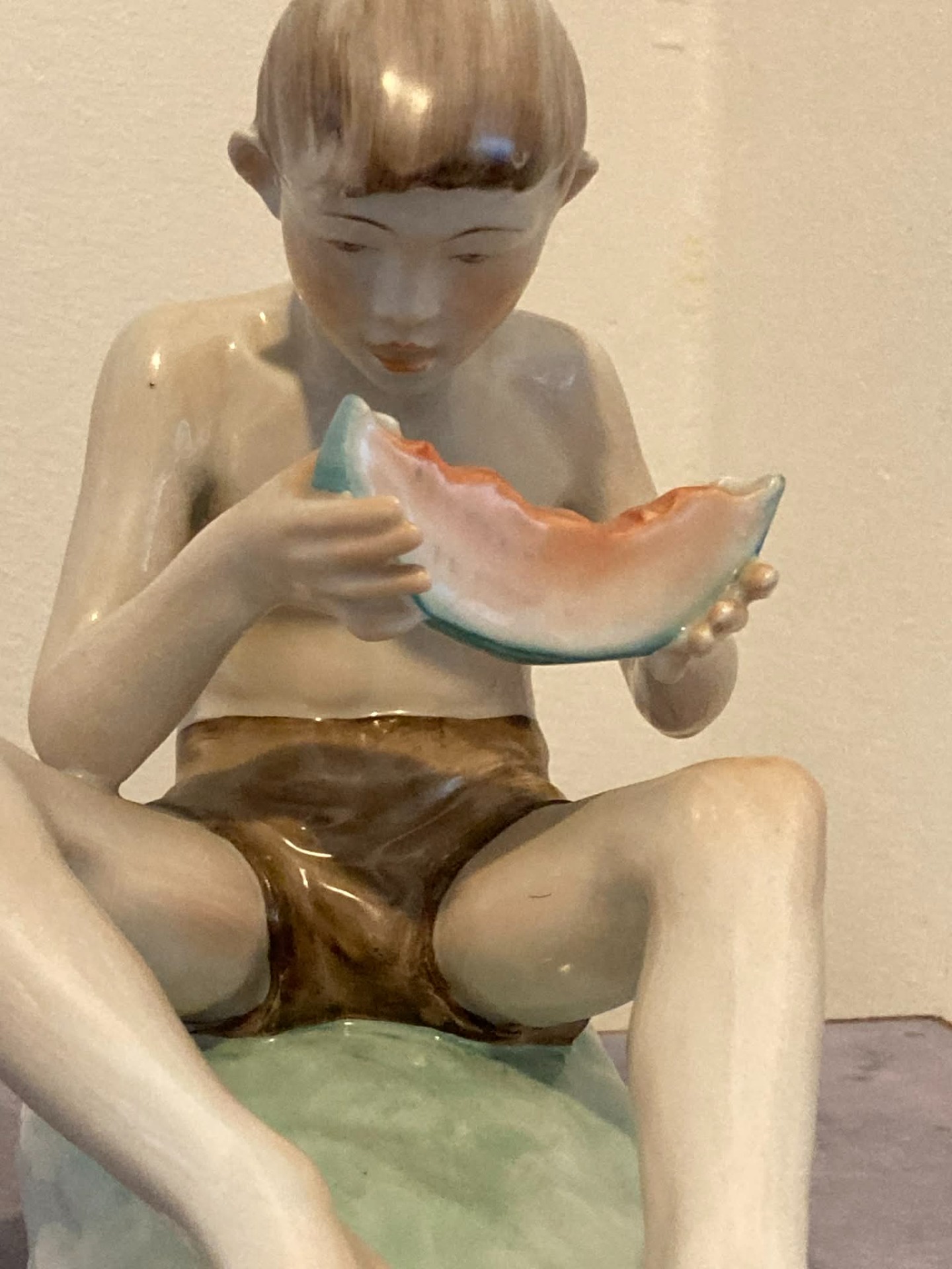 Régi, 1940 - 1950 körül készülhetett, meglehetősen ritka Zsolnay porcelán figura egy dinnyét majszoló fiú alakja! Hibátlan, jelzett darab. Talpán pajzsos-öttornyos gyári Zsolnay jelzéssel. Kézzel festett bűbájos darab! A fotókon látható, a talpán lévő perem elváltozás egy gyári, porcelán technológiai gyártáskor keletkezett elváltozás, (eldolgozatlan kitüremkedés) nem hibás a tárgy!