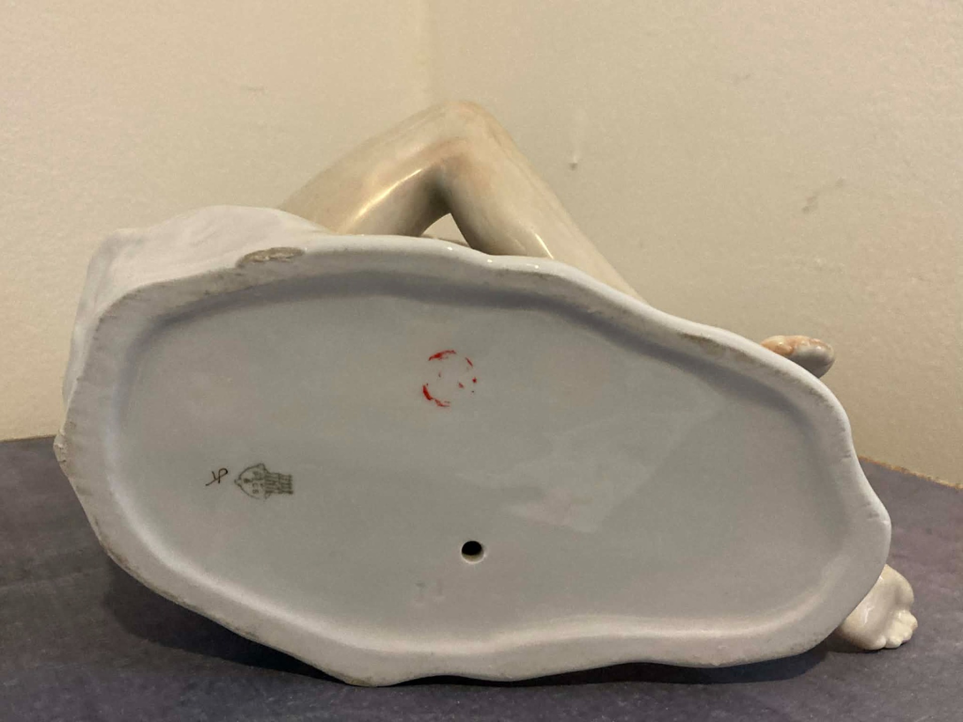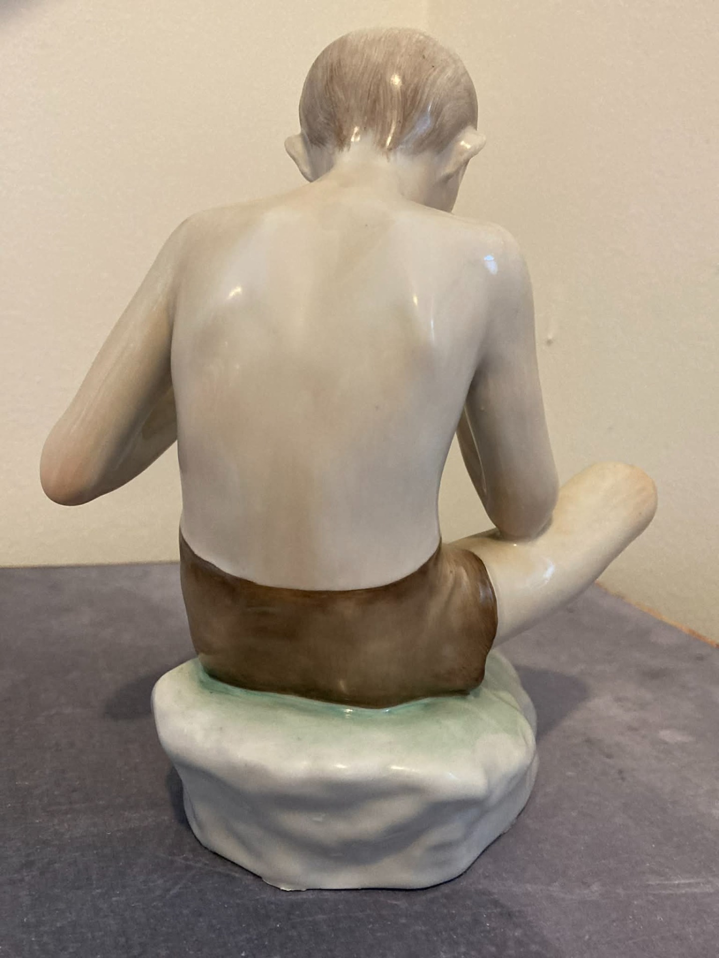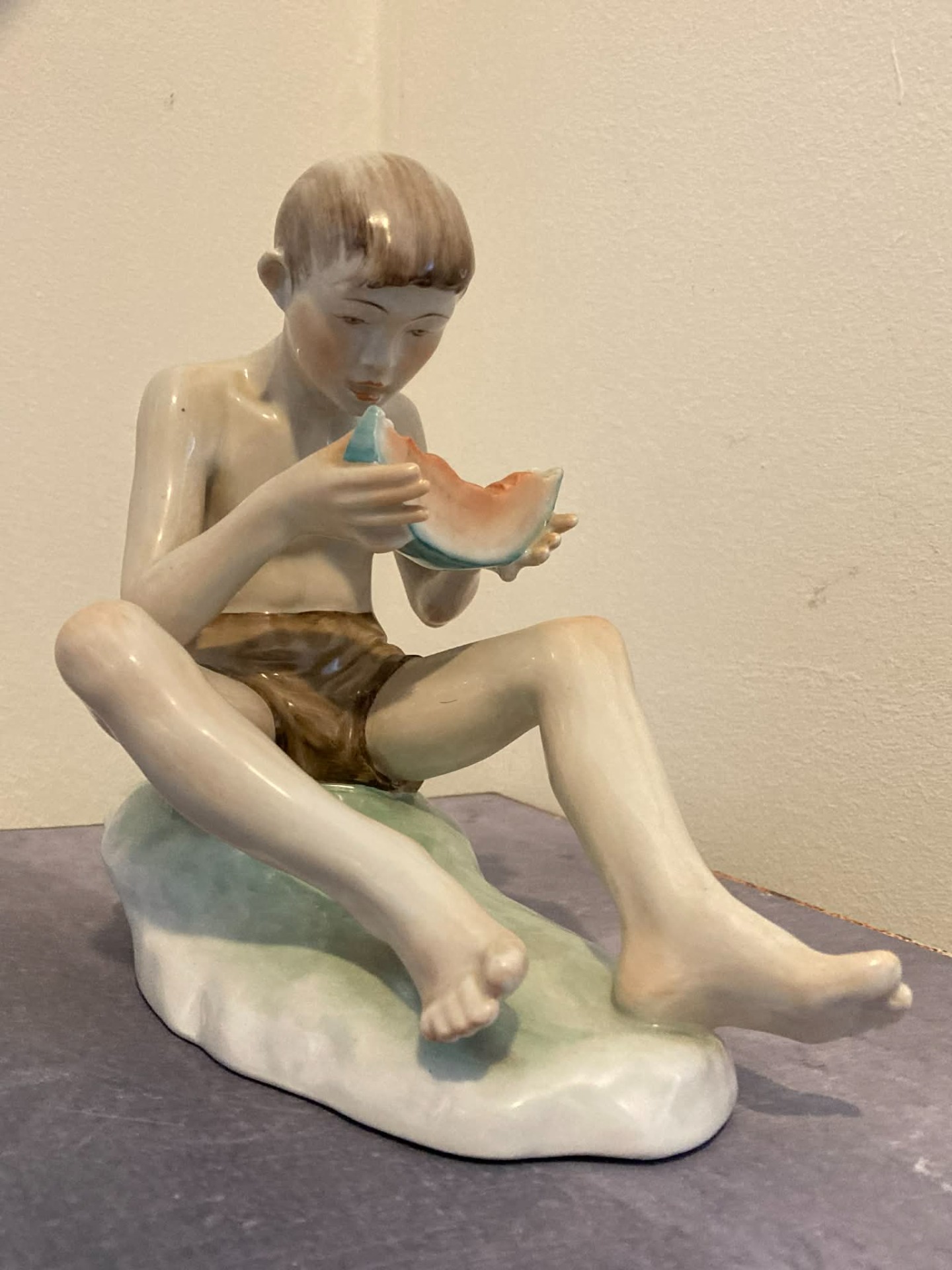 Régi, 1940 - 1950 körül készülhetett, meglehetősen ritka Zsolnay porcelán figura egy dinnyét majszoló fiú alakja! Hibátlan, jelzett darab. Talpán pajzsos-öttornyos gyári Zsolnay jelzéssel. Kézzel festett bűbájos darab! A fotókon látható, a talpán lévő perem elváltozás egy gyári, porcelán technológiai gyártáskor keletkezett elváltozás, (eldolgozatlan kitüremkedés) nem hibás a tárgy!