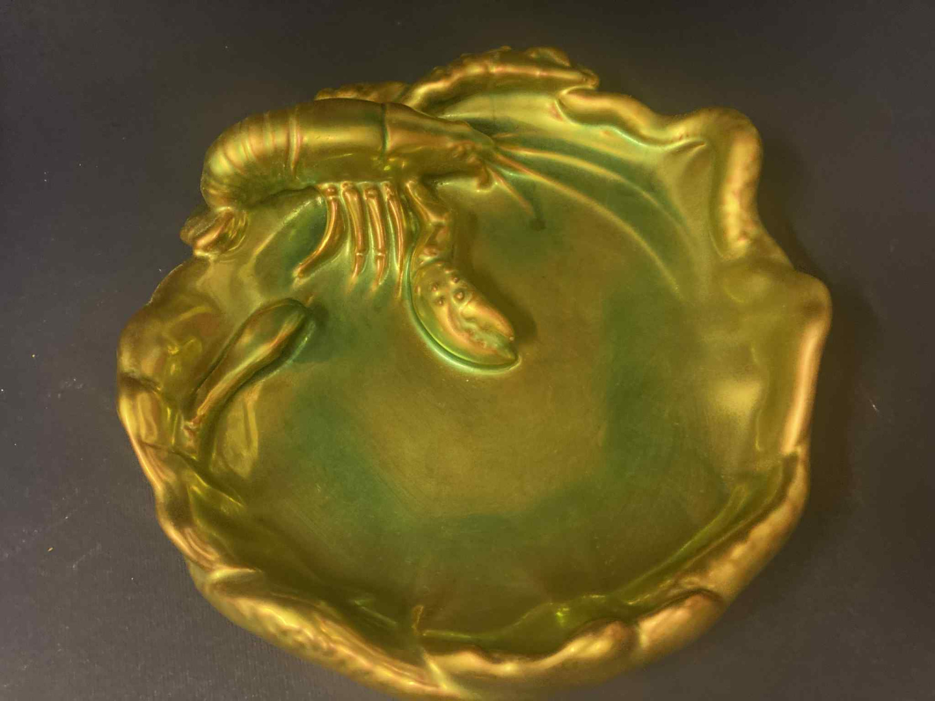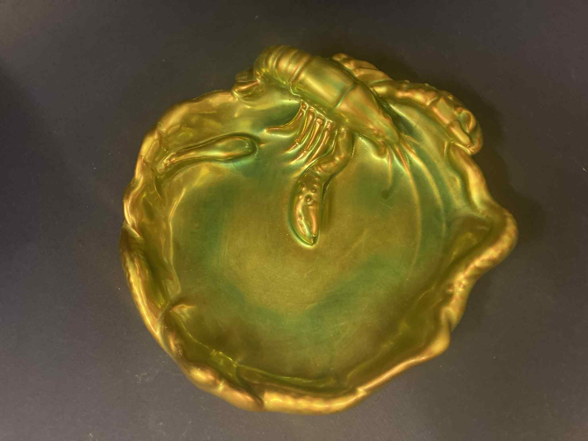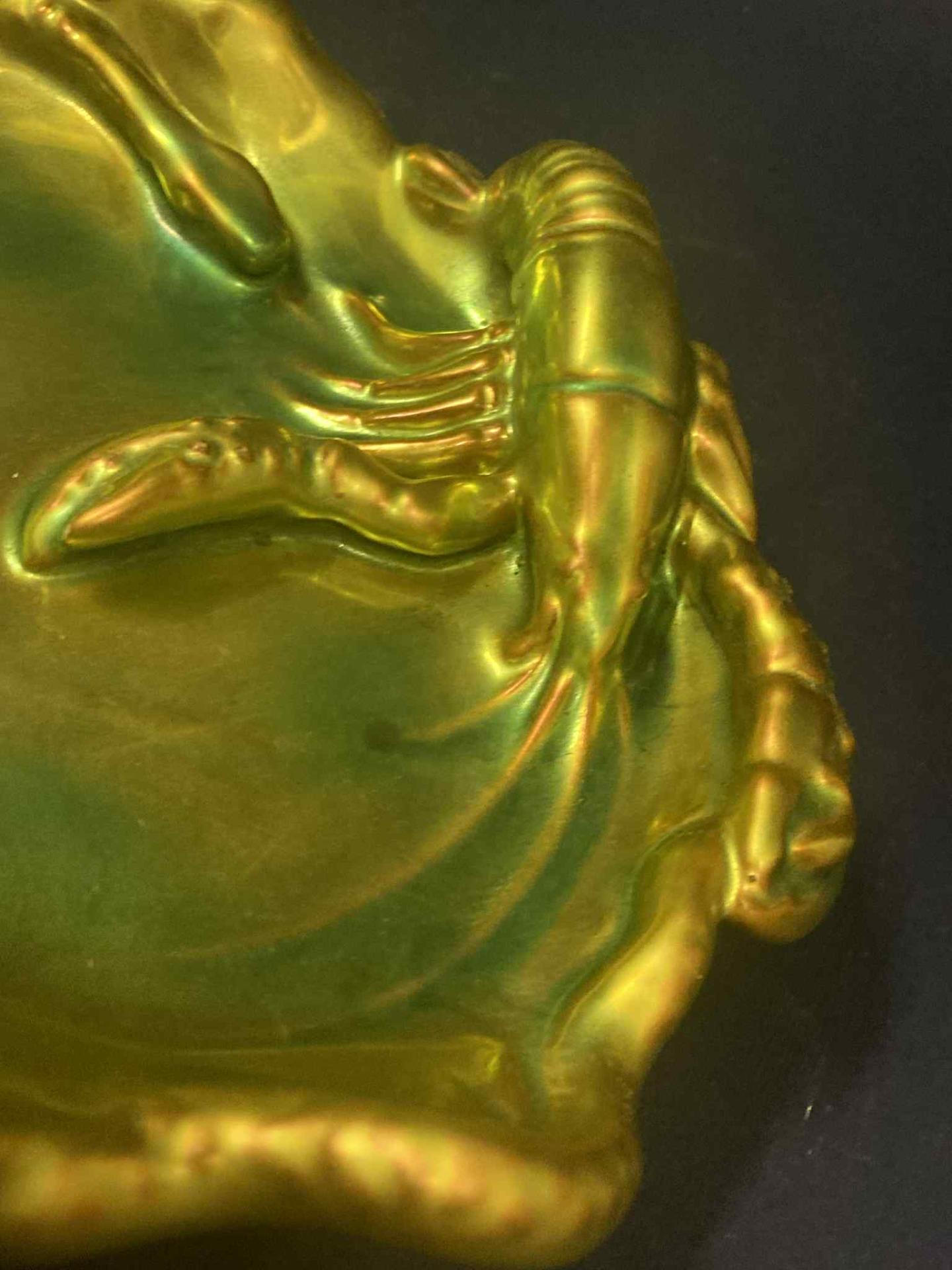 névjegytál, egy eozinmázas ún. rákos tál, mely a Zsolnay gyár legszebb,