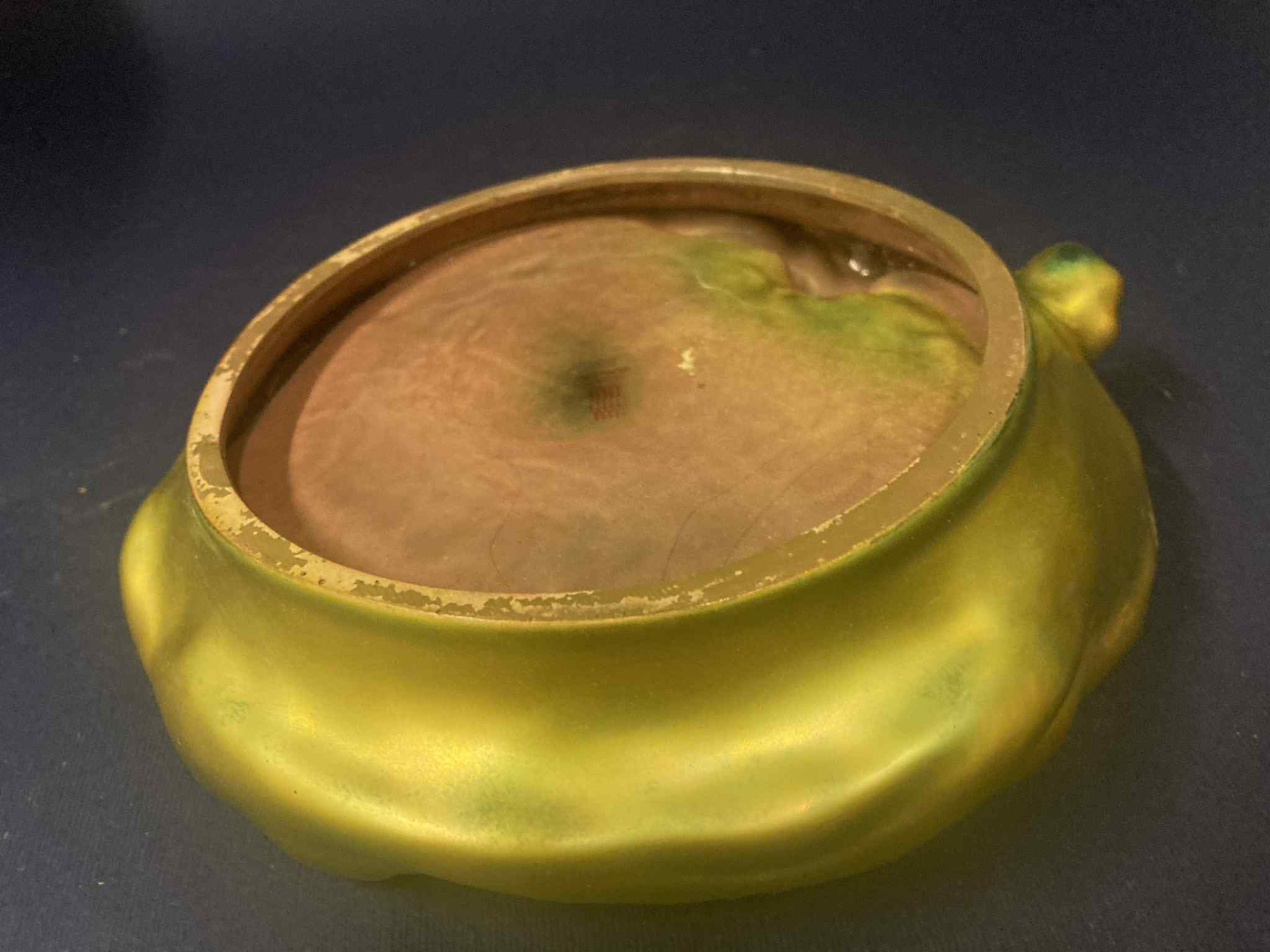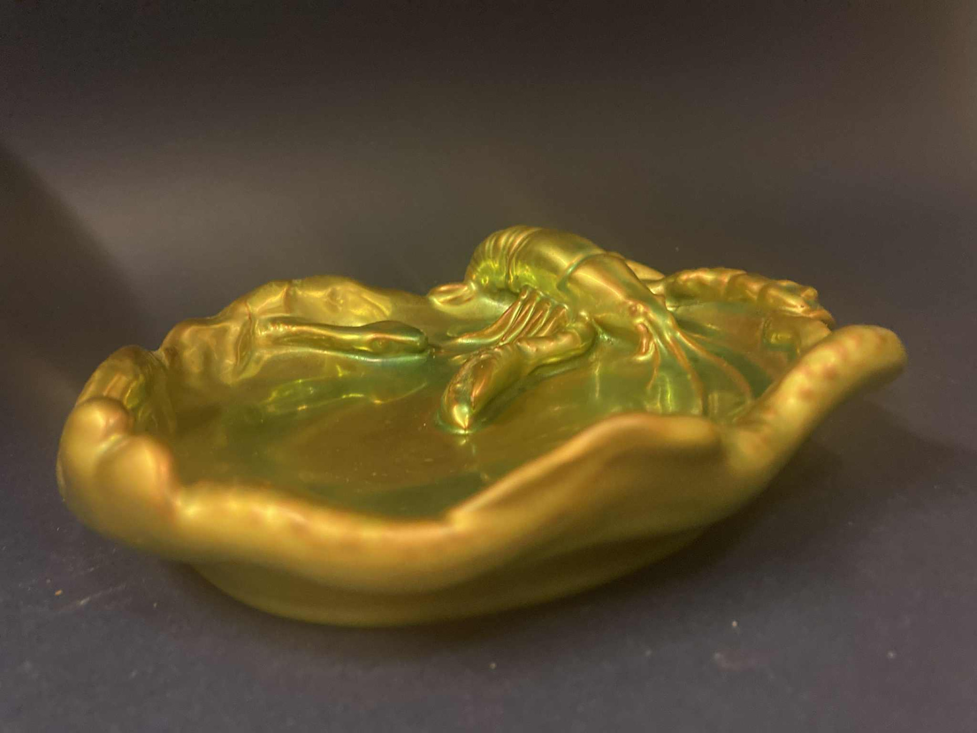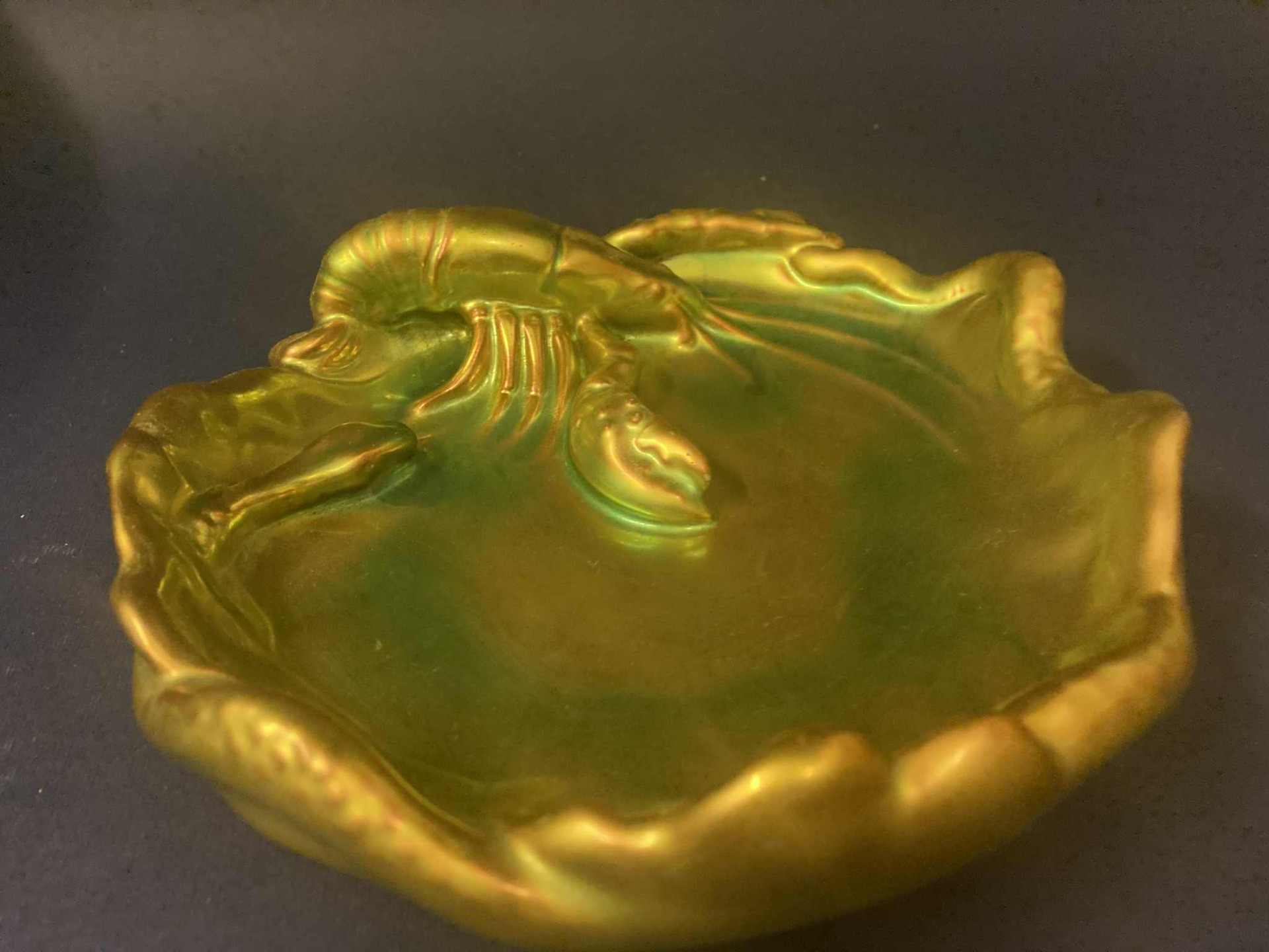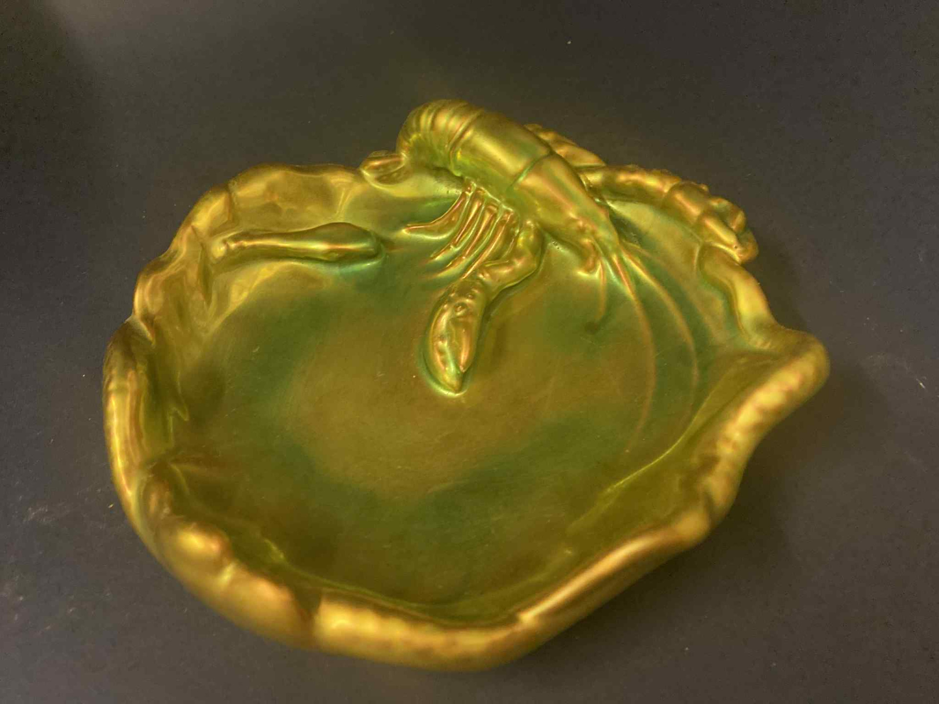 névjegytál, egy eozinmázas ún. rákos tál, mely a Zsolnay gyár legszebb,
